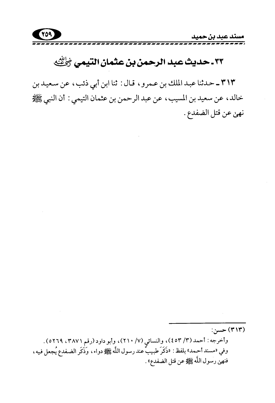 313- حَدَّثَنَا عَبْدُ الْمَلِكِ بْنُ عَمْرٍو، قَالَ: ثَنَا ابْنُ أَبِي ذِئْبٍ، عَنْ سَعِيدِ بْنِ خَالِدٍ، عَنْ سَعِيدِ بْنِ الْمُسَيِّبِ، عَنْ عَبْدِ الرَّحْمَنِ بْنِ عُثْمَانَ التَّيْمِيِّ: أَنَّ النَّبِيَّ -صَلَّى اللهُ عَلَيْهِ وَسَلَّمَ- نَهَى عن قتل الضفدع.