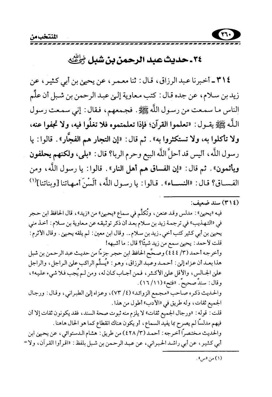 314- أَخْبَرَنَا عَبْدُ الرَّزَّاقِ، قَالَ: ثَنَا مَعْمَرٌ، عَنْ يَحْيَى بْنِ أَبِي كَثِيرٍ، عَنْ زَيْدِ بْنِ سَلَّامٍ، عَنْ جَدِّهِ قَالَ: كَتَبَ مُعَاوِيَةُ إِلَى عَبْدِ الرَّحْمَنِ بْنِ شِبْلٍ أَنْ علِّم النَّاسَ مَا سَمِعْتَ مِنْ رَسُولِ اللَّهِ صَلَّى اللهُ عَلَيْهِ وَسَلَّمَ. فَجَمَعَهُمْ، فَقَالَ: إِنِّي سَمِعْتُ رَسُولَ اللَّهِ -صَلَّى اللهُ عَلَيْهِ وَسَلَّمَ- يَقُولُ: "تَعَلَّمُوا الْقُرْآنَ؛ فَإِذَا تَعَلَّمْتُمُوهُ فَلَا تغلُوا فِيهِ، وَلَا تَجْفُوا عَنْهُ، وَلَا تَأْكُلُوا بِهِ، وَلَا تَسْتَكْثِرُوا بِهِ". ثُمَّ قَالَ: "إِنَّ التُّجَّارُ هُمُ الْفُجَّارُ". قَالُوا: يَا رَسُولَ اللَّهِ، أَلَيْسَ قَدْ أَحَلَّ اللَّهُ الْبَيْعَ وَحَرَّمَ الرِّبَا؟ قَالَ: "بَلَى، وَلَكِنَّهُمْ يَحْلِفُونَ وَيَأْثَمُونَ". ثُمَّ قَالَ: "إِنَّ الْفُسَّاقَ هُمْ أَهْلُ النَّارِ". قَالُوا: يَا رَسُولَ اللَّهِ، وَمَنِ الْفُسَّاقُ؟ قَالَ: "النِّسَاءُ". قَالُوا: يَا رَسُولَ اللَّهِ، أَلَسْنَ أُمَّهَاتِنَا [وبناتنا] 1
