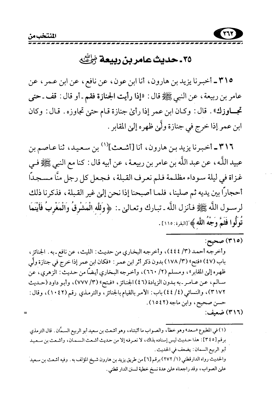315- أَخْبَرَنَا يَزِيدُ بْنُ هَارُونَ، أنا ابْنُ عَوْنٍ، عَنْ نَافِعٍ، عَنِ ابْنِ عُمَرَ، عَنْ عَامِرِ بْنِ رَبِيعَةَ، عَنِ النَّبِيِّ -صَلَّى اللهُ عَلَيْهِ وَسَلَّمَ- قَالَ: "إِذَا رَأَيْتَ الْجِنَازَةَ فَقُمْ -أَوْ قَالَ: قِفْ- حَتَّى تُجَاوِزَكَ". قَالَ: وَكَانَ ابْنُ عُمَرَ إِذَا رَأَى جِنَازَةً قَامَ حَتَّى تُجَاوِزَهُ. قَالَ: وَكَانَ ابْنُ عُمَرَ إِذَا خَرَجَ فِي جِنَازَةٍ وَلَّى ظَهْرَهُ إِلَى الْمَقَابِرِ.