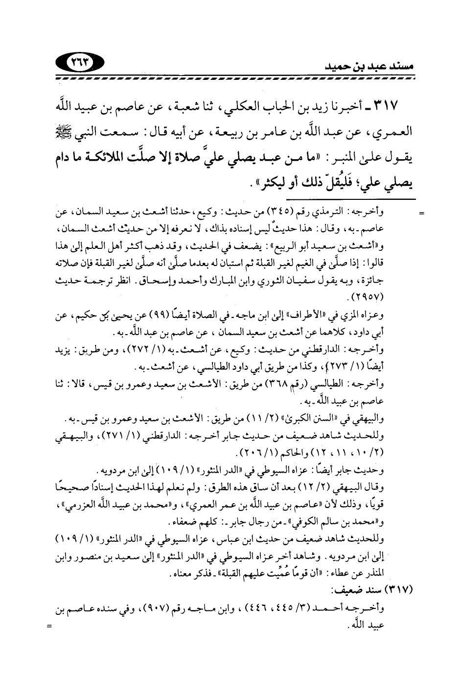 317- أَخْبَرَنَا زَيْدُ بْنُ الْحُبَابِ الْعُكْلِيُّ، ثَنَا شُعْبَةُ، عَنْ عَاصِمِ بْنِ عُبَيْدِ اللَّهِ الْعُمَرِيِّ، عَنْ عَبْدِ اللَّهِ بْنِ عَامِرِ بْنِ رَبِيعَةَ، عَنْ أَبِيهِ قَالَ: سَمِعْتُ النَّبِيَّ -صَلَّى اللهُ عَلَيْهِ وَسَلَّمَ- يَقُولُ عَلَى الْمِنْبَرِ: "مَا مِنْ عَبْدٍ يُصَلِّي عَلَيَّ صَلَاةً, إِلَّا صَلَّتْ الْمَلَائِكَةُ مَا دَامَ يُصَلِّي عَلَيَّ؛ فليقل ذلك أو ليكثر".