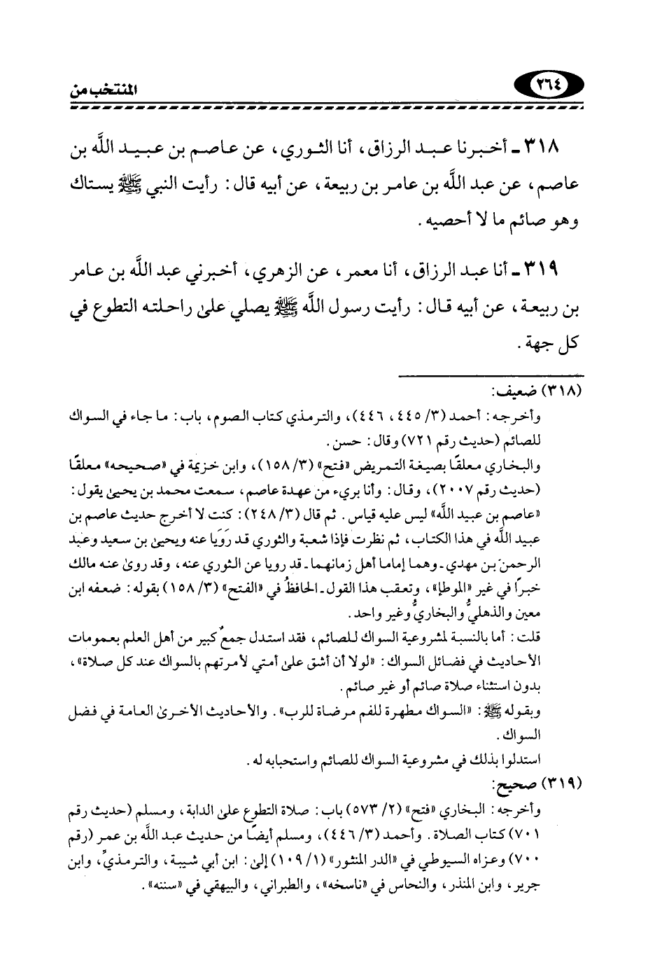 318- أَخْبَرَنَا عَبْدُ الرَّزَّاقِ، أنا الثَّوْرِيُّ، عَنْ عَاصِمِ بْنِ عُبَيْدِ اللَّهِ بْنِ عَاصِمٍ، عَنْ عَبْدِ اللَّهِ بْنِ عَامِرِ بْنِ رَبِيعَةَ، عَنْ أَبِيهِ قَالَ: رَأَيْتُ النَّبِيَّ -صَلَّى اللهُ عَلَيْهِ وَسَلَّمَ- يَسْتَاكُ, وَهُوَ صَائِمٌ مَا لَا أُحْصِيهِ.