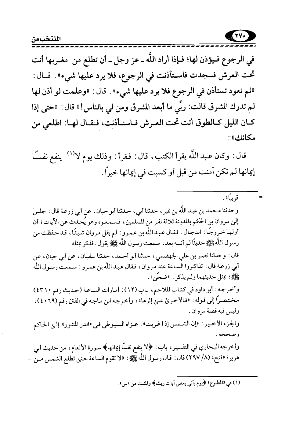 وأخرجه البخاري في التفسير، باب: {لا يَنْفَعُ نَفْسًا إِيمَانُهَا} سورة الأنعام، من حديث أبي هريرة "فتح" "8/ 297" قَالَ: قَالَ رَسُولُ اللَّهِ, صَلَّى اللهُ عَلَيْهِ وَسَلَّمَ: "لَا تَقُومُ الساعة حتى تطلع الشمس من =