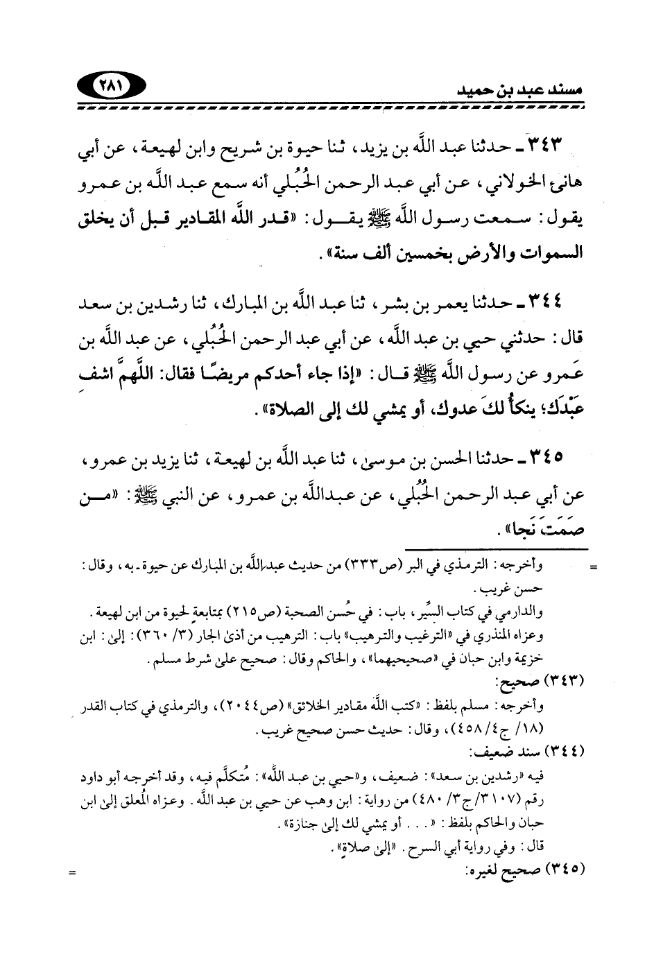 343- حَدَّثَنَا عَبْدُ اللَّهِ بْنُ يَزِيدَ، ثَنَا حَيْوَةُ بْنُ شُرَيْحٍ وَابْنُ لَهِيعَةَ، عَنْ أَبِي هَانِئٍ الْخَوْلَانِيِّ، عَنْ أَبِي عَبْدِ الرَّحْمَنِ الْحُبُلِيِّ أَنَّهُ سَمِعَ عَبْدَ اللَّهِ بْنَ عَمْرٍو يَقُولُ: سَمِعْتُ رَسُولَ اللَّهِ -صَلَّى اللهُ عَلَيْهِ وَسَلَّمَ- يَقُولُ: "قَدَّرَ اللَّهُ الْمَقَادِيرَ قَبْلَ أَنْ يخلق السموات, وَالْأَرْضَ بِخَمْسِينَ أَلْفَ سَنَةٍ".