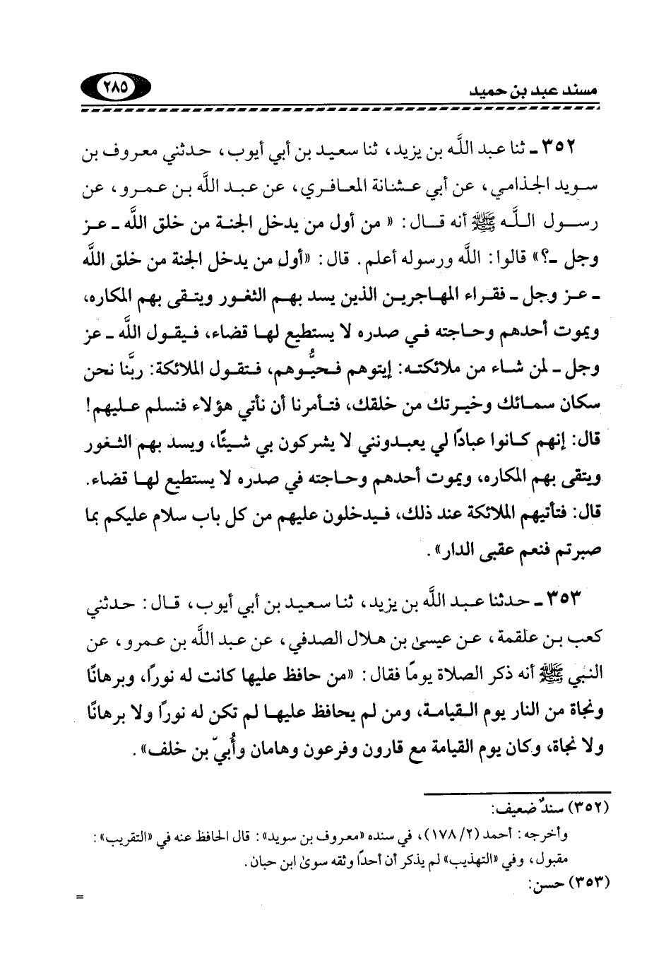 352- ثَنَا عَبْدُ اللَّهِ بْنُ يَزِيدَ، ثَنَا سَعِيدُ بْنُ أَبِي أَيُّوبَ، حَدَّثَنِي مَعْرُوفُ بْنُ سُوَيْدٍ الْجُذَامِيُّ، عَنْ أَبِي عُشَّانَةَ الْمَعَافِرِيِّ، عَنْ عَبْدِ اللَّهِ بْنِ عَمْرٍو، عَنْ رَسُولَ اللَّهِ -صَلَّى اللهُ عَلَيْهِ وَسَلَّمَ- أَنَّهُ قَالَ: "مَنْ أَوَّلُ مَنْ يَدْخُلُ الْجَنَّةَ مِنْ خَلْقِ اللَّهِ, عَزَّ وَجَلَّ؟ " قَالُوا: اللَّهُ وَرَسُولُهُ أَعْلَمُ. قَالَ: "أَوَّلُ مَنْ يَدْخُلُ الْجَنَّةَ مِنْ خَلْقِ اللَّهِ -عَزَّ وَجَلَّ- فُقَرَاءُ الْمُهَاجِرِينَ, الَّذِينَ يُسَدُّ بِهِمِ الثُّغُورُ وَيُتَّقَى بِهِمُ الْمَكَارِهُ، وَيَمُوتُ أَحَدُهُمْ وَحَاجَتُهُ فِي صَدْرِهِ لَا يَسْتَطِيعُ لَهَا قَضَاءً، فَيَقُولُ اللَّهُ -عَزَّ وَجَلَّ- لِمَنْ شَاءَ مِنْ مَلَائِكَتِهِ: إيتُوهُمْ فَحَيُّوهُمْ، فَتَقُولُ الْمَلَائِكَةُ: رَبَّنَا نَحْنُ سُكَّانُ سَمَائِكَ وَخِيرَتُكَ مِنْ خَلْقِكَ، فَتَأْمُرُنَا أَنْ نَأْتِيَ هَؤُلَاءِ فَنُسَلِّمَ عَلَيْهِمْ! قَالَ: إِنَّهُمْ كَانُوا عِبَادًا لِي يَعْبُدُونَنِي لَا يُشْرِكُونَ بِي شَيْئًا، وَيُسَدُّ بِهِمِ الثُّغُورُ وَيُتَّقَى بِهِمُ الْمَكَارِهُ، وَيَمُوتُ أَحَدُهُمْ وَحَاجَتُهُ فِي صَدْرِهِ لَا يَسْتَطِيعُ لَهَا قَضَاءً. قَالَ: فَتَأْتِيهِمُ الْمَلَائِكَةُ عِنْدَ ذَلِكَ، فَيَدْخُلُونَ عَلَيْهِمْ مِنْ كُلِّ بَابٍ {سَلامٌ عَلَيْكُمْ بِمَا صَبَرْتُمْ فَنِعْمَ عُقْبَى الدَّارِ} ".