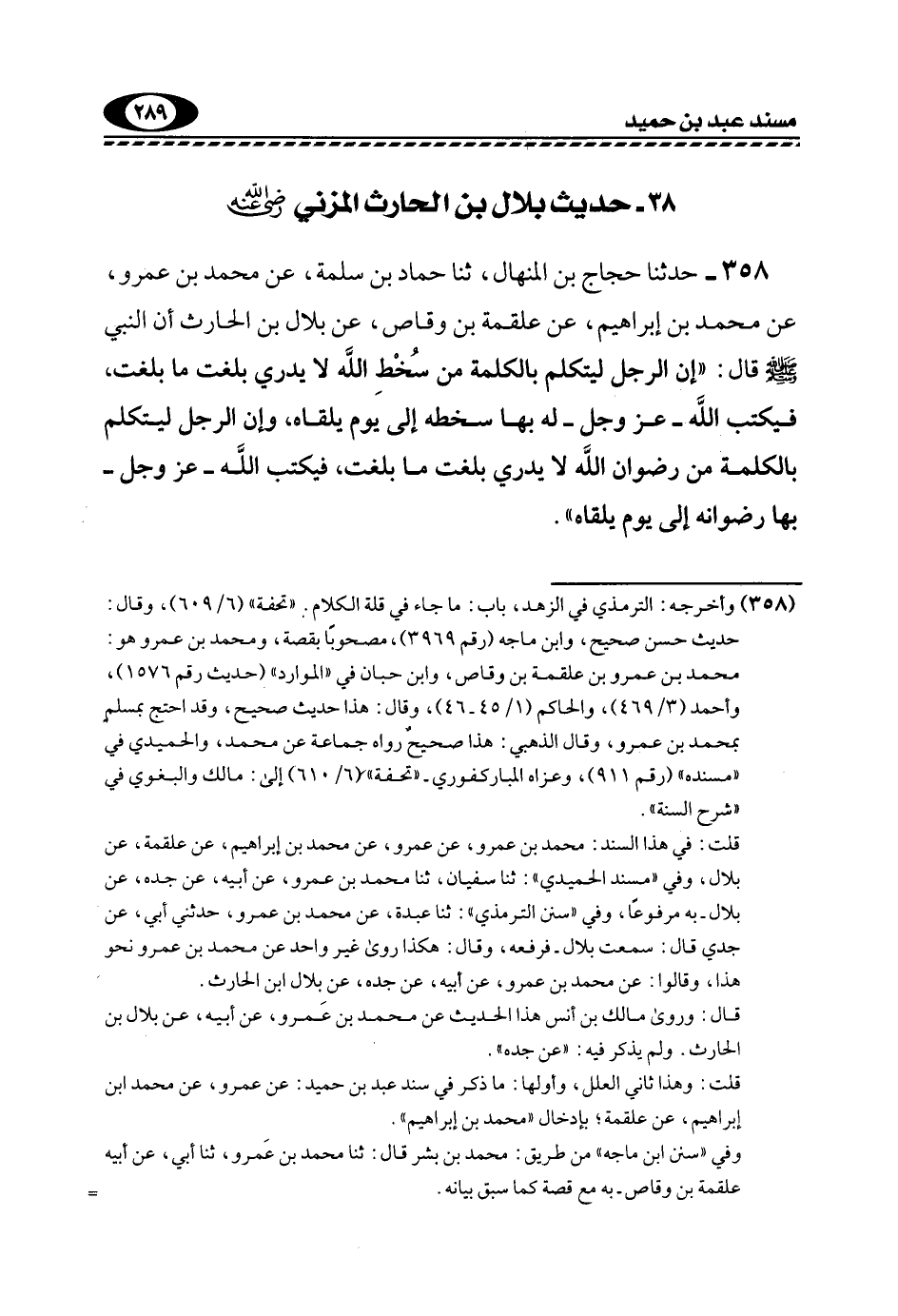 358- حَدَّثَنَا حَجَّاجُ بْنُ الْمِنْهَالِ، ثَنَا حَمَّادُ بْنُ سَلَمَةَ، عَنْ مُحَمَّدِ بْنِ عَمْرٍو، عَنْ مُحَمَّدِ بْنِ إِبْرَاهِيمَ، عَنْ عَلْقَمَةَ بْنِ وَقَّاصٍ، عَنْ بِلَالِ بْنِ الْحَارِثِ, أَنَّ النَّبِيَّ -صَلَّى اللهُ عَلَيْهِ وَسَلَّمَ- قَالَ: "إِنَّ الرَّجُلَ لِيَتَكَلَّمُ بِالْكَلِمَةِ مِنْ سَخَطِ اللَّهِ لَا يَدْرِي بَلَغَتْ مَا بَلَغَتْ، فَيَكْتُبُ اللَّهُ -عَزَّ وَجَلَّ- لَهُ بِهَا سَخَطَهُ إِلَى يَوْمِ يَلْقَاهُ، وَإِنَّ الرَّجُلَ لَيَتَكَلَّمُ بِالْكَلِمَةِ مِنْ رِضْوَانِ اللَّهِ لَا يَدْرِي بَلَغَتْ مَا بَلَغَتْ، فَيَكْتُبُ اللَّهُ -عَزَّ وَجَلَّ- بِهَا رضوانه إلى يوم يلقاه".