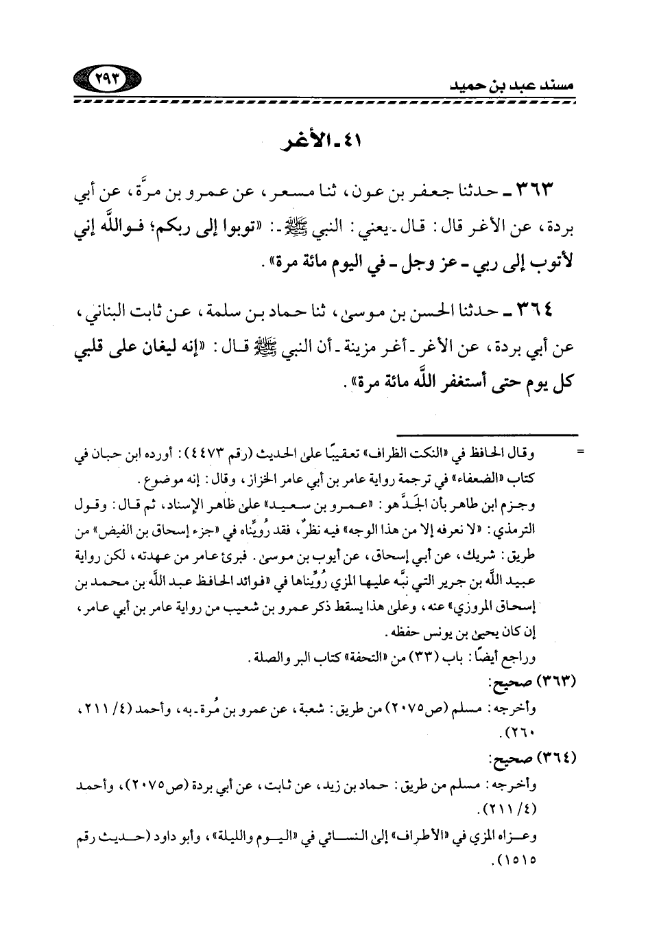 363- حَدَّثَنَا جَعْفَرُ بْنُ عَوْنٍ، ثَنَا مِسْعَرٌ، عَنْ عَمْرِو بْنِ مُرَّةَ، عَنْ أَبِي بُرْدَةَ، عَنِ الْأَغَرِّ قَالَ: قَالَ, يَعْنِي: النَّبِيَّ صلى لله عَلَيْهِ وَسَلَّمَ: "تُوبُوا إِلَى رَبِّكُمْ؛ فَوَاللَّهِ إِنِّي لَأَتُوبُ إِلَى رَبِّي -عَزَّ وَجَلَّ- فِي الْيَوْمِ مِائَةَ مَرَّةٍ".