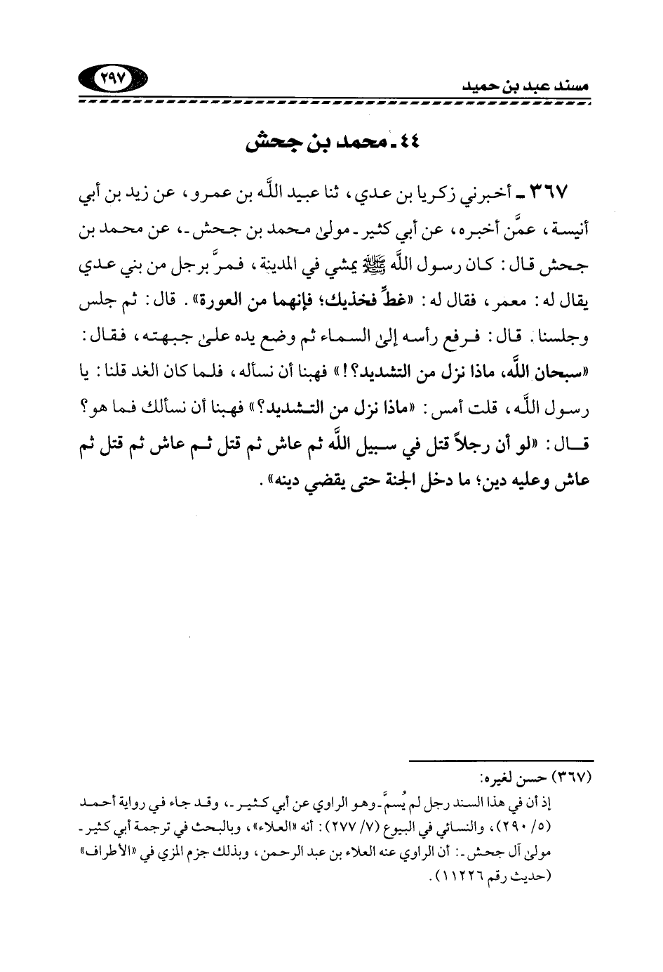 367- أَخْبَرَنِي زَكَرِيَّا بْنُ عَدِيٍّ، ثَنَا عُبَيْدُ اللَّهِ بْنُ عَمْرٍو، عَنْ زَيْدِ بْنِ أَبِي أُنَيْسَةَ، عَمَّنْ أَخْبَرَهُ، عَنْ أَبِي كَثِيرٍ -مَوْلَى مُحَمَّدِ بْنِ جَحْشٍ- عَنْ مُحَمَّدِ بْنِ جَحْشٍ قَالَ: كَانَ رَسُولُ اللَّهِ -صَلَّى اللهُ عَلَيْهِ وَسَلَّمَ- يَمْشِي فِي الْمَدِينَةِ، فَمَرَّ بِرَجُلٍ مِنْ بَنِي عَدِيٍّ يُقَالُ لَهُ: مَعْمَرٌ، فَقَالَ لَهُ: "غَطِّ فَخِذَيْكَ؛ فَإِنَّهُمَا مِنَ الْعَوْرَةِ". قَالَ: ثُمَّ جَلَسَ وَجَلَسْنَا. قَالَ: فَرَفَعَ رَأْسَهُ إِلَى السَّمَاءِ ثُمَّ وَضَعَ يَدَهُ عَلَى جَبْهَتِهِ، فَقَالَ: "سُبْحَانَ اللَّهِ، مَاذَا نَزَلَ مِنَ التَّشْدِيدِ؟! " فَهِبْنَا أَنْ نَسْأَلَهُ، فَلَمَّا كَانَ الْغَدُ قُلْنَا: يَا رَسُولَ اللَّهِ، قُلْتَ أَمْسِ: "مَاذَا نَزَلَ مِنَ التَّشْدِيدِ؟ " فَهِبْنَا أَنْ نَسْأَلَكَ, فَمَا هُوَ؟ قَالَ: "لَوْ أَنَّ رَجُلًا قُتِلَ فِي سَبِيلِ اللَّهِ ثُمَّ عَاشَ ثُمَّ قُتِلَ ثُمَّ عَاشَ ثُمَّ قُتِلَ ثُمَّ عَاشَ وَعَلَيْهِ دَيْنٌ؛ مَا دَخَلَ الجنة حتى يقضي دينه".