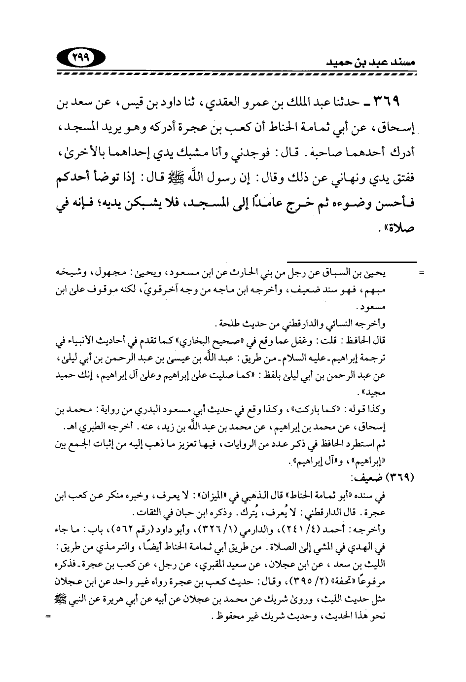 369- حَدَّثَنَا عَبْدُ الْمَلِكِ بْنُ عَمْرٍو الْعَقَدِيُّ، ثَنَا دَاوُدُ بْنُ قَيْسٍ، عَنْ سَعْدِ بْنِ إِسْحَاقَ، عَنْ أَبِي ثُمَامَةَ الْحَنَّاطِ, أَنَّ كَعْبَ بْنَ عُجْرَةَ أَدْرَكَهُ وَهُوَ يُرِيدُ الْمَسْجِدَ، أَدْرَكَ أَحَدُهُمَا صَاحِبَهُ. قَالَ: فَوَجَدَنِي وَأَنَا مُشَبِّكٌ يَدِي إِحْدَاهُمَا بِالْأُخْرَى، فَفَتَقَ يَدِي وَنَهَانِي عَنْ ذَلِكَ وَقَالَ: إِنَّ رَسُولَ اللَّهِ -صَلَّى اللهُ عَلَيْهِ وَسَلَّمَ- قَالَ: "إِذَا تَوَضَّأَ أَحَدُكُمْ فَأَحْسَنَ وُضُوءَهُ, ثُمَّ خَرَجَ عَامِدًا إِلَى الْمَسْجِدِ، فلا يشبكن يديه؛ فإنه في صلاة".