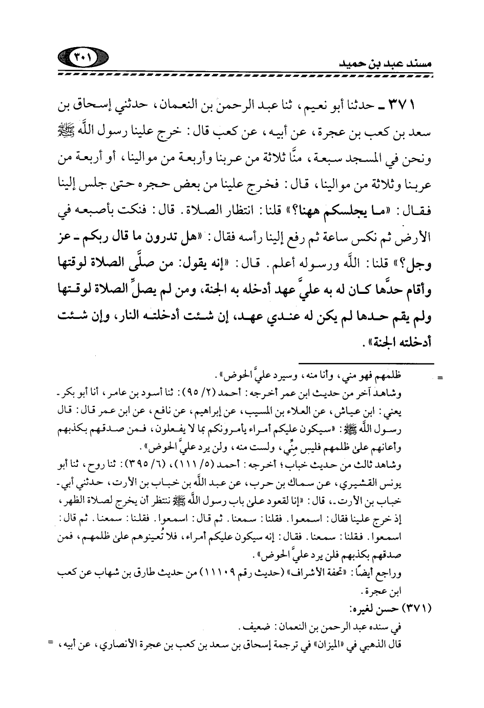 371- حَدَّثَنَا أَبُو نُعَيْمٍ، ثَنَا عَبْدُ الرَّحْمَنِ بْنُ النُّعْمَانِ، حَدَّثَنِي إِسْحَاقُ بْنُ سَعْدِ بْنِ كَعْبِ بْنِ عُجْرَةَ، عَنْ أَبِيهِ، عَنْ كَعْبٍ قَالَ: خَرَجَ عَلَيْنَا رَسُولُ اللَّهِ -صَلَّى اللهُ عَلَيْهِ وَسَلَّمَ- وَنَحْنُ فِي الْمَسْجِدِ سَبْعَةٌ، مِنَّا ثَلَاثَةٌ مِنْ عَرَبِنَا وَأَرْبَعَةٌ مِنْ مَوَالِينَا، أَوْ أَرْبَعَةٌ مِنْ عَرَبِنَا وَثَلَاثَةٌ مِنْ مَوَالِينَا، قَالَ: فَخَرَجَ عَلَيْنَا مِنْ بَعْضِ حُجَرِهِ حَتَّى جَلَسَ إلينا فقال: "ما يجلسكم ههنا؟ " قُلْنَا: انْتِظَارُ الصَّلَاةِ. قَالَ: فَنَكَتَ بِإِصْبَعِهِ فِي الْأَرْضِ ثُمَّ نَكَسَ سَاعَةً ثُمَّ رَفَعَ إِلَيْنَا رَأْسَهُ فَقَالَ: "هَلْ تَدْرُونَ مَا قَالَ رَبُّكُمْ عَزَّ وَجَلَّ؟ " قُلْنَا: اللَّهُ وَرَسُولُهُ أَعْلَمُ. قَالَ: "إِنَّهُ يَقُولُ: مَنْ صَلَّى الصَّلَاةَ لِوَقْتِهَا, وَأَقَامَ حَدَّهَا كَانَ لَهُ بِهِ عَلَيَّ عَهْدٌ أُدْخِلُهُ بِهِ الْجَنَّةَ، وَمَنْ لَمْ يُصَلِّ الصَّلَاةَ لِوَقْتِهَا, وَلَمْ يُقِمْ حَدَّهَا لَمْ يَكُنْ لَهُ عِنْدِي عَهْدٌ، إِنْ شِئْتُ أَدْخَلْتُهُ النَّارَ، وَإِنْ شِئْتُ أَدْخَلْتُهُ الْجَنَّةَ".