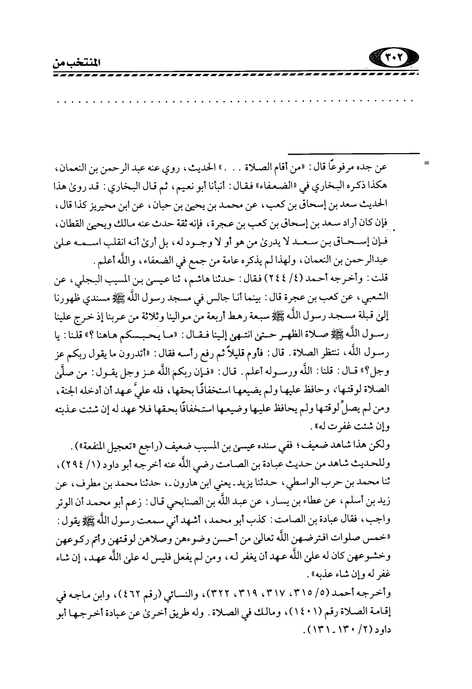 قلت: وأخرجه أحمد "4/ 244" فقال: حدثنا هاشم، ثنا عيسى بن المسيب البجلي، عن الشعبي، عَنْ كَعْبِ بْنِ عُجْرَةَ قَالَ: بينما أنا جالس في مَسْجِدِ رَسُولِ اللَّهِ -صَلَّى اللهُ عليه وسلم- مسندي ظهورنا إلى قبلة مَسْجِدِ رَسُولِ اللَّهِ -صَلَّى اللهُ عليه وسلم- سبعة رهط, أربعة من موالينا وثلاثة من عربنا, إِذْ خَرَجَ عَلَيْنَا رَسُولُ اللَّهِ -صَلَّى اللهُ عَلَيْهِ وَسَلَّمَ- صَلَاةَ الظهر حتى انتهى إلينا فقال: "ما يحبسكم ههنا؟ " قلنا: يا رسول الله، ننتظر الصلاة. قال: فأومأ قليلا ثم رفع رأسه فقال: "أتدرون ما يقول ربكم عز وجل؟ " قال: قُلْنَا: اللَّهُ وَرَسُولُهُ أَعْلَمُ. قَالَ: "فإن ربكم الله -عز وجل- يَقُولُ: مَنْ صَلَّى الصَّلَاةَ لِوَقْتِهَا، وحافظ عليها ولم يضيعها استخفافا بحقها؛ فله علي عهد أن أدخله الجنة، ومن لم يصل لوقتها ولم يحافظ عليها وضيعها استخفافا بحقها؛ فلا عهد له إن شئت عذبته, وإن شئت غفرت له".