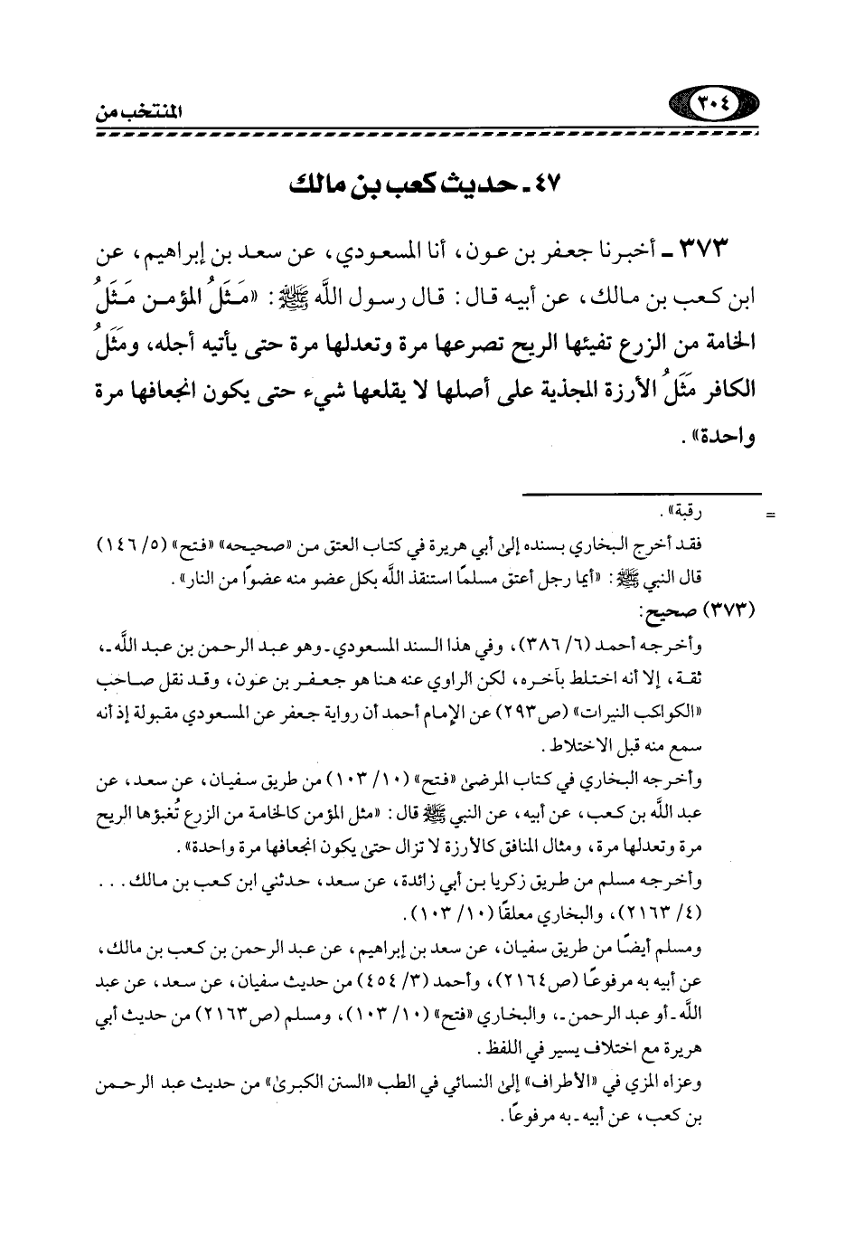 وأخرجه البخاري في كتاب المرضى "فتح" "10/ 103" من طريق سفيان، عن سعد، عَنْ عَبْدِ اللَّهِ بْنِ كَعْبٍ، عَنْ أَبِيهِ، عَنِ النَّبِيِّ -صَلَّى اللهُ عَلَيْهِ وَسَلَّمَ- قَالَ: "مَثَلُ المؤمن كالخامة من الزرع, تُغبئها الريح مرة وتعدلها مرة، ومثال المنافق كالأرزة لا تزال حَتَّى يَكُونَ انْجِعَافُهَا مَرَّةً وَاحِدَةً".