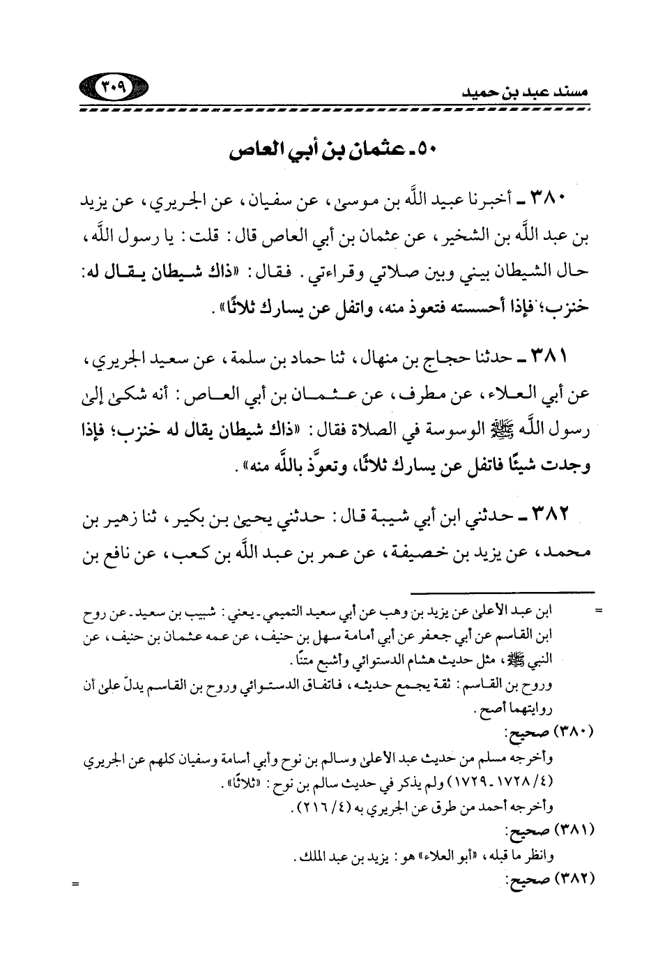 381- حَدَّثَنَا حَجَّاجُ بْنُ مِنْهَالٍ، ثَنَا حَمَّادُ بْنُ سَلَمَةَ، عَنْ سَعِيدٍ الْجُرَيْرِيِّ، عَنْ أَبِي الْعَلَاءِ، عَنْ مُطَرِّفٍ، عَنْ عُثْمَانَ بْنِ أَبِي العاص, أنه شَكَا إِلَى رَسُولِ اللَّهِ -صَلَّى اللهُ عَلَيْهِ وَسَلَّمَ- الْوَسْوَسَةَ فِي الصَّلَاةِ, فَقَالَ: "ذَاكَ شَيْطَانٌ يُقَالُ له: خنزب؛ فإذا وجدت شَيْئًا فَاتْفُلْ عَنْ يَسَارِكَ ثَلَاثًا، وَتَعَوَّذَ بِاللَّهِ مِنْهُ".