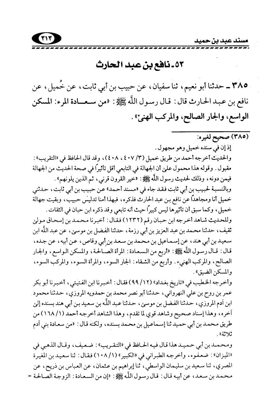 385- حَدَّثَنَا أَبُو نُعَيْمٍ، ثَنَا سُفْيَانُ، عَنْ حَبِيبِ بْنِ أَبِي ثَابِتٍ، عَنْ خميل، عَنْ نَافِعِ بْنِ عَبْدِ الْحَارِثِ قَالَ: قَالَ رَسُولُ اللَّهِ, صَلَّى اللهُ عَلَيْهِ وَسَلَّمَ: "مِنْ سَعَادَةِ الْمَرْءِ: الْمَسْكَنُ الْوَاسِعُ، وَالْجَارُ الصَّالِحُ، والمركب الهنيء".