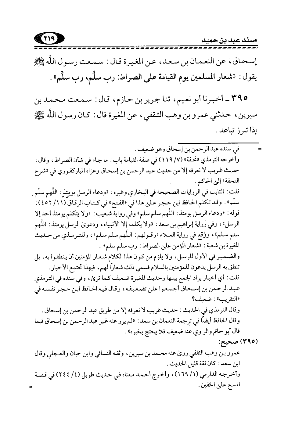 إِسْحَاقَ، عَنِ النُّعْمَانِ بْنِ سَعْدٍ، عَنِ الْمُغِيرَةِ قَالَ: سَمِعْتُ رَسُولَ اللَّهِ -صَلَّى اللهُ عَلَيْهِ وَسَلَّمَ- يَقُولُ: "شِعَارُ الْمُسْلِمِينَ يَوْمَ الْقِيَامَةِ عَلَى الصِّرَاطِ: رَبِّ سلِّم، رَبِّ سلِّم".