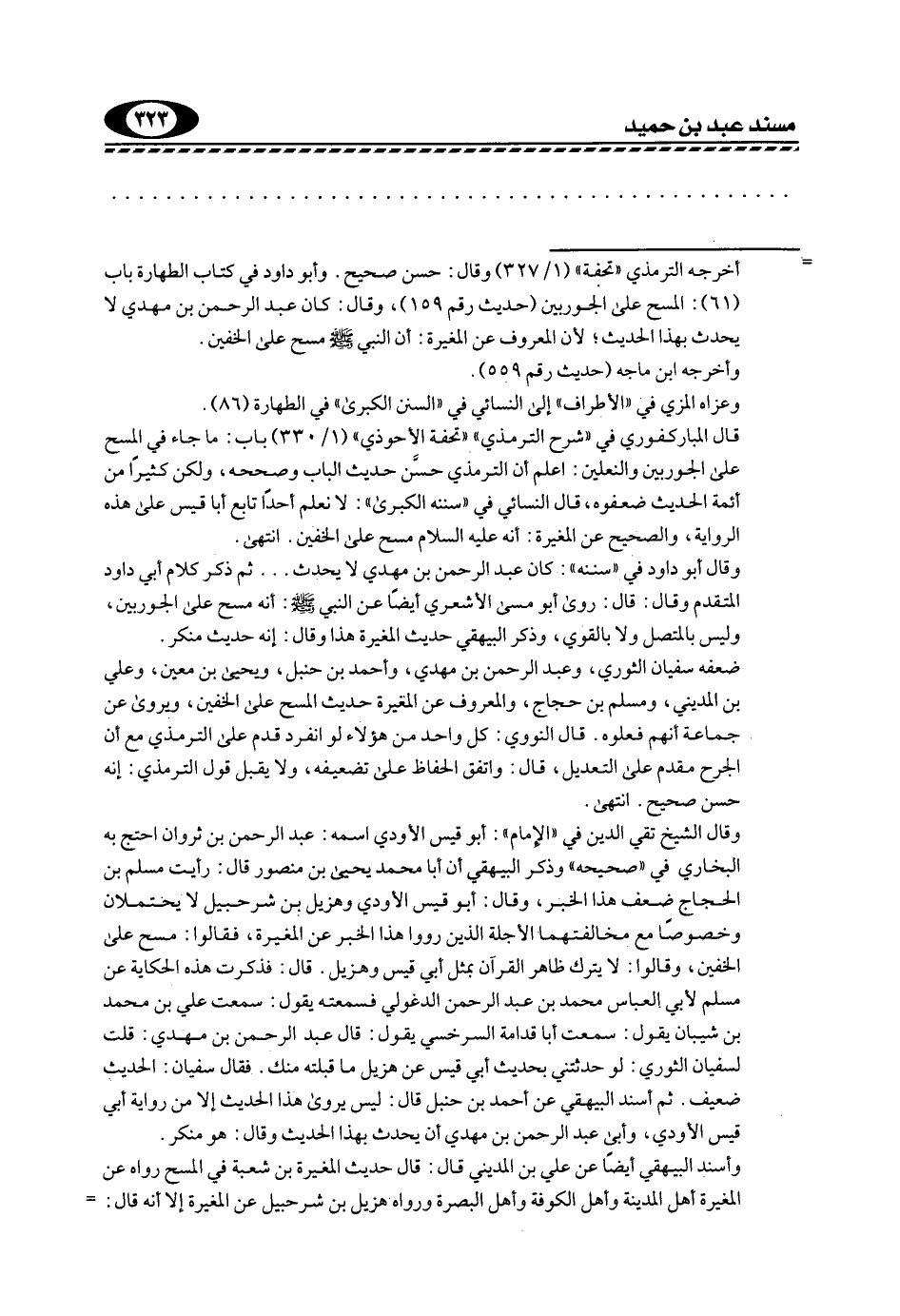 وقال أبو داود في "سننه": كان عبد الرحمن بن مهدي لا يحدث ... ثم ذكر كلام أبي داود المتقدم وقال: قال: روى أبو موسى الأشعري أيضا عَنِ النَّبِيِّ -صَلَّى اللهُ عَلَيْهِ وسلم- أنه مسح على الجوربين، وليس بالمتصل ولا بالقوي، وذكر البيهقي حديث المغيرة هذا, وقال: إنه حديث منكر.