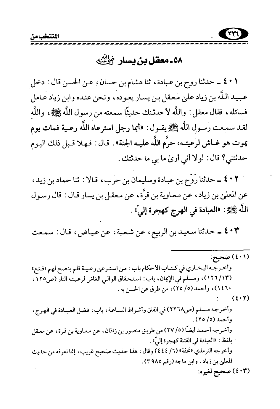 401- حَدَّثَنَا رَوْحُ بْنُ عُبَادَةَ، ثَنَا هِشَامُ بْنُ حَسَّانَ، عَنْ الْحَسَنِ قَالَ: دَخَلَ عُبَيْدُ اللَّهِ بْنُ زِيَادٍ عَلَى مَعْقِلِ بْنِ يَسَارٍ يَعُودُهُ، وَنَحْنُ عِنْدَهُ وَابْنُ زياد عامل فسأله، فَقَالَ مَعْقِلٌ: وَاللَّهِ لَأُحَدِّثَنَّكَ حَدِيثًا سَمِعْتُهُ مِنْ رَسُولِ اللَّهِ -صَلَّى اللهُ عَلَيْهِ وَسَلَّمَ- وَاللَّهِ لَقَدْ سَمِعْتُ رَسُولَ اللَّهِ -صَلَّى اللهُ عَلَيْهِ وَسَلَّمَ- يَقُولُ: "أَيُّمَا رَجُلٍ اسْتَرْعَاهُ اللَّهُ رَعِيَّةً, فَمَاتَ يَوْمَ يموت هو غَاشٌّ لِرَعِيَّتِهِ، حَرَّمَ اللَّهُ عَلَيْهِ الجنة". قال: فهلا قبل ذلك الْيَوْمِ حَدَّثْتَنِي؟ قَالَ: لَوْلَا أَنِّي أَرَى مَا بِي, مَا حَدَّثْتُكَ.