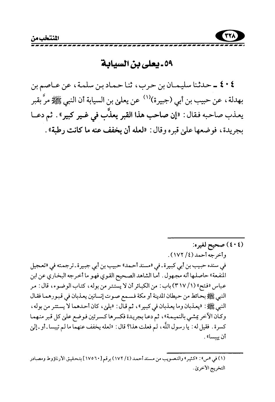 404- حَدَّثَنَا سُلَيْمَانُ بْنُ حَرْبٍ، ثَنَا حَمَّادُ بْنُ سَلَمَةَ، عَنْ عَاصِمِ بْنِ بَهْدَلَةَ، عَنْ حَبِيبِ بْنِ أَبِي "جَبِيرَةَ"1 عَنْ يَعْلَى بْنِ السِّيَابَةِ, أَنَّ النَّبِيَّ -صَلَّى اللهُ عَلَيْهِ وَسَلَّمَ- مَرَّ بِقَبْرٍ يُعَذَّبُ صَاحِبُهُ, فَقَالَ: "إِنَّ صَاحِبَ هَذَا الْقَبْرِ يُعَذَّبُ فِي غَيْرِ كَبِيرٍ". ثُمَّ دَعَا بِجَرِيدَةٍ، فَوَضَعَهَا عَلَى قَبْرِهِ وَقَالَ: "لَعَلَّهُ أَنْ يُخَفِّفَ عَنْهُ, مَا كانت رطبة".