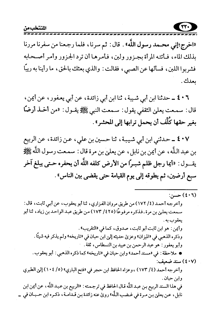 407- حَدَّثَنِي ابْنُ أَبِي شَيْبَةَ، ثَنَا حُسَيْنُ بْنُ عَلِيٍّ، عَنْ زَائِدَةَ، عَنِ الرَّبِيعِ بْنِ عَبْدِ اللَّهِ، عَنْ أَيْمَنَ بْنِ نَابِلٍ، عَنْ يَعْلَى بْنِ مُرَّةَ قَالَ: سَمِعْتُ رَسُولَ اللَّهِ -صَلَّى اللهُ عَلَيْهِ وَسَلَّمَ- يَقُولُ: "أَيُّمَا رَجُلٍ ظَلَمَ شِبْرًا مِنَ الْأَرْضِ؛ كَلَّفَهُ اللَّهُ أَنْ يَحْفِرَهُ حَتَّى يَبْلُغَ آخِرَ سَبْعِ أَرَضِينَ، ثُمَّ يُطَوَّقَهُ إِلَى يَوْمِ الْقِيَامَةِ حتى يقضى بين الناس".