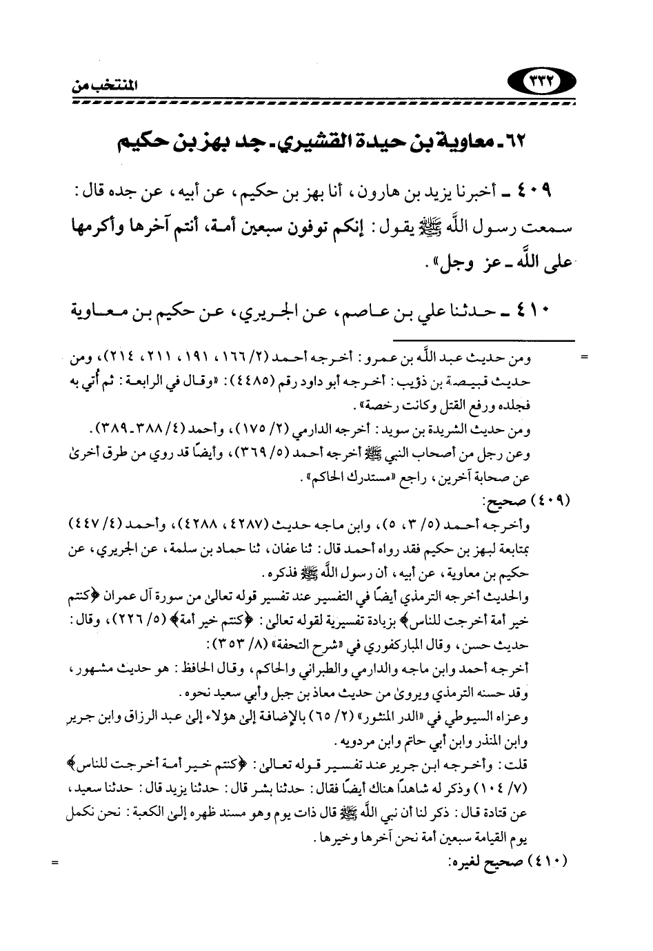 409- أَخْبَرَنَا يَزِيدُ بْنُ هَارُونَ، أنا بَهْزُ بْنُ حَكِيمٍ، عَنْ أَبِيهِ، عَنْ جَدِّهِ قَالَ: سَمِعْتُ رَسُولَ اللَّهِ -صَلَّى اللهُ عَلَيْهِ وَسَلَّمَ- يَقُولُ: "إِنَّكُمْ تُوفُونَ سَبْعِينَ أُمَّةً، أَنْتُمْ آخِرُهَا وَأَكْرَمُهَا عَلَى اللَّهِ, عَزَّ وَجَلَّ".