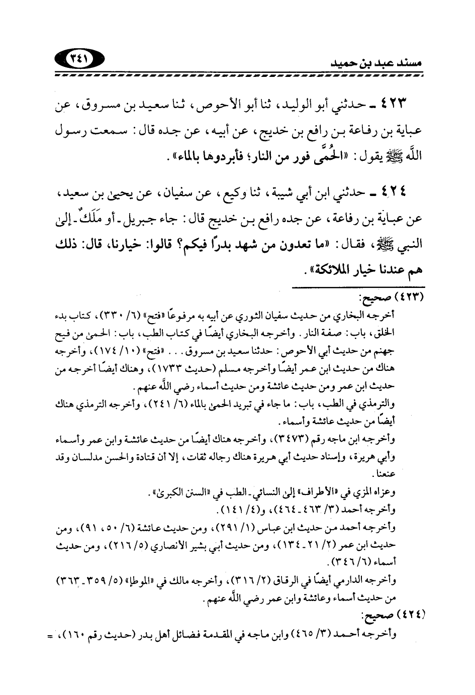 424- حَدَّثَنِي ابْنُ أَبِي شَيْبَةَ، ثَنَا وَكِيعٌ، عَنْ سُفْيَانَ، عَنْ يَحْيَى بْنِ سَعِيدٍ، عَنْ عَبَايَةَ بْنِ رِفَاعَةَ، عَنْ جَدِّهِ رَافِعِ بْنِ خَدِيجٍ قَالَ: جَاءَ جِبْرِيلُ -أَوْ مَلَك- إِلَى النَّبِيِّ -صَلَّى اللهُ عَلَيْهِ وَسَلَّمَ- فَقَالَ: "مَا تَعُدُّونَ مَنْ شَهِدَ بَدْرًا فيكم؟ قالوا: خيارنا، قال: ذلك هم عندنا خيار الملائكة".