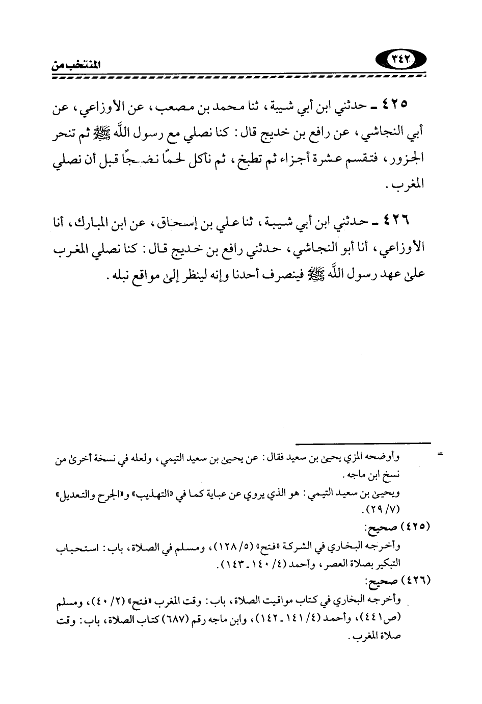 425- حَدَّثَنِي ابْنُ أَبِي شَيْبَةَ، ثَنَا مُحَمَّدُ بْنُ مُصْعَبٍ، عَنِ الْأَوْزَاعِيِّ، عَنْ أَبِي النَّجَاشِيِّ، عَنْ رَافِعِ بْنِ خَدِيجٍ قَالَ: كُنَّا نُصَلِّي مَعَ رَسُولِ اللَّهِ -صَلَّى اللهُ عَلَيْهِ وَسَلَّمَ- ثُمَّ تُنْحَرُ الْجَزُورُ، فَتُقْسَمُ عَشْرَةَ أَجْزَاءٍ ثُمَّ تُطْبَخُ، ثُمَّ نَأْكُلُ لَحْمًا نَضِيجًا قَبْلَ أَنْ نُصَلِّيَ الْمَغْرِبَ.