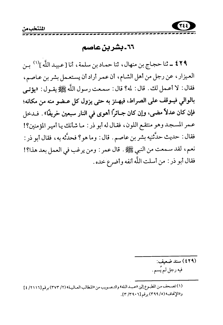 429- ثنا حَجَّاجُ بْنُ مِنْهَالٍ، ثَنَا حماد بن سلمة، أنا [عبيد اللَّهِ] 1 بْنُ الْعَيْزَارِ، عَنْ رَجُلٍ مِنْ أَهْلِ الشَّامِ، أَنَّ عُمَرَ أَرَادَ أَنْ يَسْتَعْمِلَ بِشْرَ بْنَ عَاصِمٍ، فَقَالَ: لَا أَعْمَلُ لَكَ. قَالَ: لِمَهْ؟ قَالَ: سَمِعْتُ رَسُولَ اللَّهِ -صَلَّى اللهُ عَلَيْهِ وَسَلَّمَ- يَقُولُ: "يُؤْتَى بِالْوَالِي فَيُوقَفُ عَلَى الصِّرَاطِ، فَيَهْتَزُّ بِهِ حَتَّى يَزُولَ كل عضو منه من مَكَانِهِ؛ فَإِنْ كَانَ عَدْلَا مَضَى، وَإِنْ كَانَ جَائِرًا أَهْوَى فِي النَّارِ سَبْعِينَ خَرِيفًا". فَدَخَلَ عُمَرُ الْمَسْجِدَ وَهُوَ مُنْتَقِعُ اللَّوْنِ، فَقَالَ لَهُ أَبُو ذَرٍّ: مَا شَأْنُكَ يَا أَمِيرَ الْمُؤْمِنِينَ؟! فَقَالَ: حَدِيثٌ حَدَّثَنِيهِ بِشْرُ بْنُ عَاصِمٍ. قَالَ: وَمَا هُوَ؟ فَحَدَّثَهُ بِهِ، فَقَالَ أبو ذر: نعم، لقد سمعته مِنَ النَّبِيِّ صَلَّى اللهُ عَلَيْهِ وَسَلَّمَ. قَالَ عُمَرُ: وَمَنْ يَرْغَبُ فِي الْعَمَلِ بَعْدَ هَذَا؟! فَقَالَ أَبُو ذَرٍّ: مَنْ أَسْلَتَ اللَّهُ أنفه, وأضرع خده.