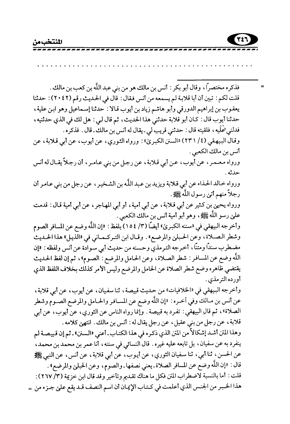 وقال البيهقي "4/ 231" "السنن الكبرى": ورواه الثوري، عَنْ أَيُّوبَ، عَنْ أَبِي قِلَابَةَ، عن أنس بن مالك الكعبي.