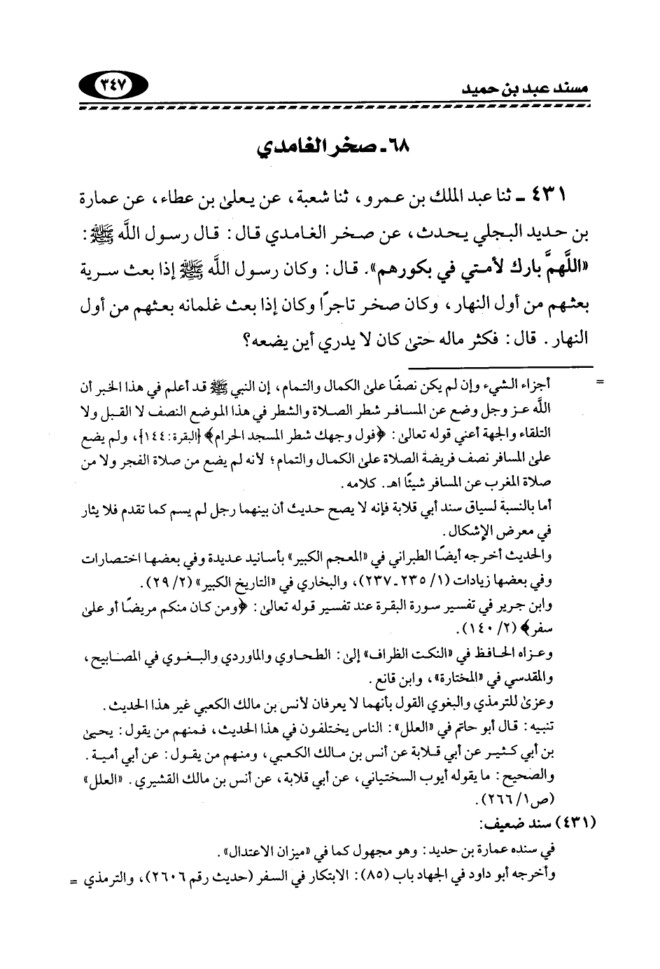 431- ثَنَا عَبْدُ الْمَلِكِ بْنُ عَمْرٍو، ثَنَا شُعْبَةُ، عَنِ يَعْلَى بْنِ عَطَاءٍ، عَنْ عُمَارَةَ بْنِ حَدِيدٍ الْبَجَلِيِّ يُحَدِّثُ، عَنْ صَخْرٍ الْغَامِدِيِّ قَالَ: قَالَ رَسُولُ اللَّهِ, صَلَّى اللهُ عَلَيْهِ وَسَلَّمَ: "اللَّهُمَّ بَارِكْ لِأُمَّتِي فِي بُكُورِهِمْ". قَالَ: وَكَانَ رَسُولُ اللَّهِ -صَلَّى اللهُ عَلَيْهِ وَسَلَّمَ- إِذَا بَعَثَ سَرِيَّةً بَعَثَهُمْ مِنْ أَوَّلِ النَّهَارِ، وَكَانَ صَخْرٌ تَاجِرًا, وَكَانَ إِذَا بَعَثَ غِلْمَانَهُ بَعَثَهُمْ مِنْ أَوَّلِ النَّهَارِ. قَالَ: فَكَثُرَ مَالُهُ حَتَّى كَانَ لَا يَدْرِي أَيْنَ يَضَعُهُ؟