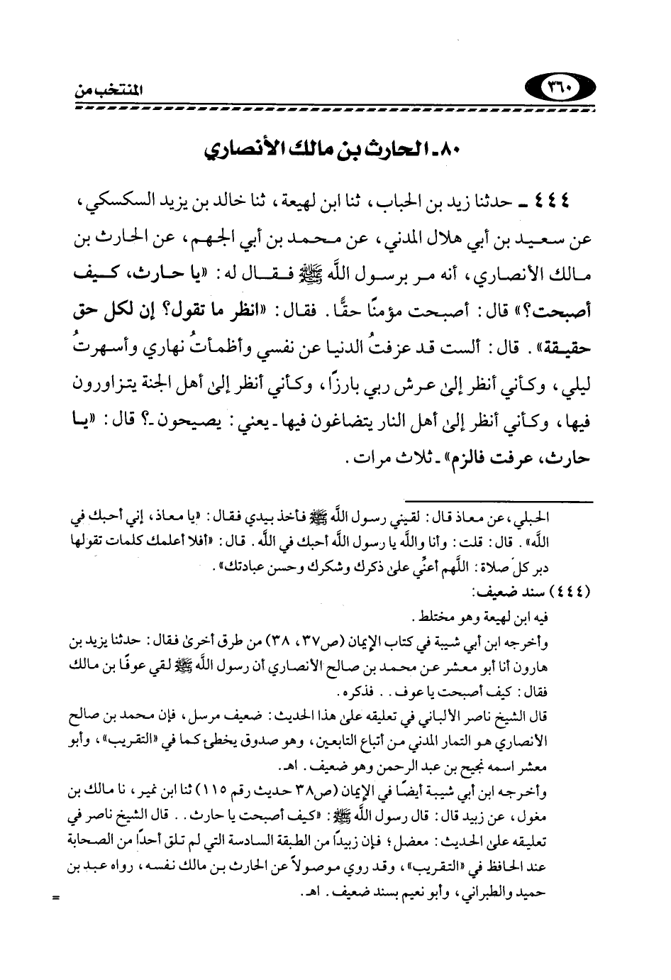 444- حَدَّثَنَا زَيْدُ بْنُ الْحُبَابِ، ثَنَا ابْنُ لَهِيعَةَ، ثَنَا خَالِدُ بْنُ يَزِيدَ السَّكْسَكِيُّ، عَنْ سَعِيدِ بْنِ أَبِي هِلَالٍ الْمَدَنِيِّ، عَنْ مُحَمَّدِ بْنِ أَبِي الْجَهْمِ، عَنِ الْحَارِثِ بْنِ مَالِكٍ الْأَنْصَارِيِّ، أَنَّهُ مَرَّ بِرَسُولِ اللَّهِ -صَلَّى اللهُ عَلَيْهِ وَسَلَّمَ- فَقَالَ لَهُ: "يَا حَارِثُ، كَيْفَ أَصْبَحْتَ؟ " قَالَ: أَصْبَحْتُ مُؤْمِنًا حَقًّا. فَقَالَ: "انْظُرْ مَا تَقُولُ, إِنَّ لِكُلِّ حَقٍّ حَقِيقَةً". قَالَ: أَلَسْتُ قَدْ عزفتُ الدُّنْيَا عَنْ نَفْسِي وأظمأتُ نَهَارِي وأسهرتُ لَيْلِي، وَكَأَنِّي أَنْظُرُ إِلَى عَرْشِ رَبِّي بَارِزًا، وَكَأَنِّي أَنْظُرُ إِلَى أَهْلِ الْجَنَّةِ يَتَزَاوَرُونَ فِيهَا، وَكَأَنِّي أَنْظُرُ إِلَى أَهْلِ النَّارِ يَتَضَاغَوْنَ فِيهَا، يَعْنِي: يَصِيحُونَ؟ قَالَ: "يَا حَارِثُ، عَرَفْتَ فالزم" ثلاث مرات.