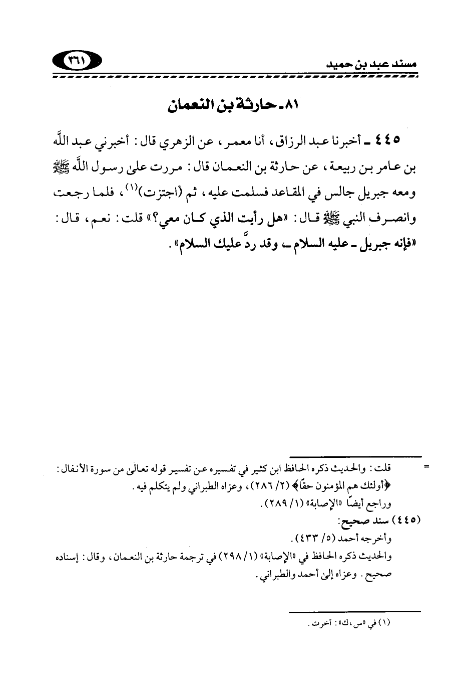 445- أَخْبَرَنَا عَبْدُ الرَّزَّاقِ، أنا مَعْمَرٌ، عَنِ الزُّهْرِيِّ قَالَ: أَخْبَرَنِي عَبْدُ اللَّهِ بْنُ عَامِرِ بْنِ رَبِيعَةَ، عَنْ حَارِثَةَ بْنِ النُّعْمَانِ قَالَ: مَرَرْتُ عَلَى رَسُولَ اللَّهِ -صَلَّى اللهُ عَلَيْهِ وسلم- ومعه جبريل جالسا فِي الْمَقَاعِدِ, فَسَلَّمْتُ عَلَيْهِ، ثُمَّ "اجْتَزْتُ"1، فَلَمَّا رَجَعْتُ وَانْصَرَفَ النَّبِيُّ -صَلَّى اللهُ عَلَيْهِ وَسَلَّمَ- قَالَ: "هَلْ رَأَيْتَ الَّذِي كَانَ مَعِي؟ " قُلْتُ: نَعَمْ، قَالَ: "فَإِنَّهُ جِبْرِيلُ -عَلَيْهِ السَّلَامُ- وَقَدْ رَدَّ عَلَيْكَ السلام".