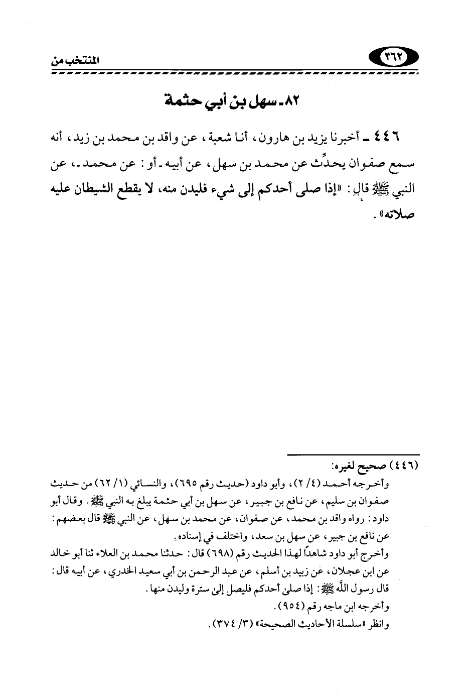 446- أَخْبَرَنَا يَزِيدُ بْنُ هَارُونَ, أنا شُعْبَةُ، عَنْ وَاقِدِ بْنِ مُحَمَّدِ بْنِ زَيْدٍ، أَنَّهُ سَمِعَ صَفْوَانَ يُحَدِّثُ عَنْ مُحَمَّدِ بْنِ سَهْلٍ، عَنْ أَبِيهِ -أَوْ: عَنْ مُحَمَّدٍ- عَنِ النَّبِيَّ -صَلَّى اللهُ عَلَيْهِ وَسَلَّمَ- قَالَ: "إِذَا صَلَّى أَحَدُكُمْ إِلَى شَيْءٍ فليدنُ مِنْهُ، لَا يَقْطَعَ الشيطان عليه صلاته".