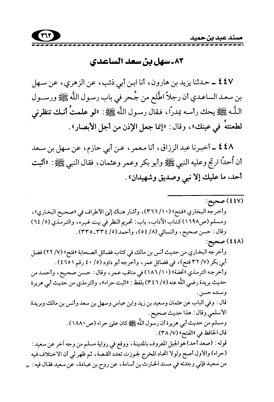 448- أَخْبَرَنَا عَبْدُ الرَّزَّاقِ، أنا مَعْمَرٌ، عَنْ أَبِي حَازِمٍ، عَنْ سَهْلِ بْنِ سَعْدٍ, أَنَّ أُحُدا ارْتَجَّ وَعَلَيْهِ النَّبِيُّ -صَلَّى اللهُ عَلَيْهِ وَسَلَّمَ- وَأَبُو بَكْرٍ وَعُمَرُ وَعُثْمَانُ، فَقَالَ النَّبِيُّ صَلَّى اللهُ عَلَيْهِ وَسَلَّمَ: "اثْبُتْ أُحُدُ، مَا عَلَيْكَ إِلَّا نَبِيٌّ وَصِدِّيقٌ وَشَهِيدَانِ".