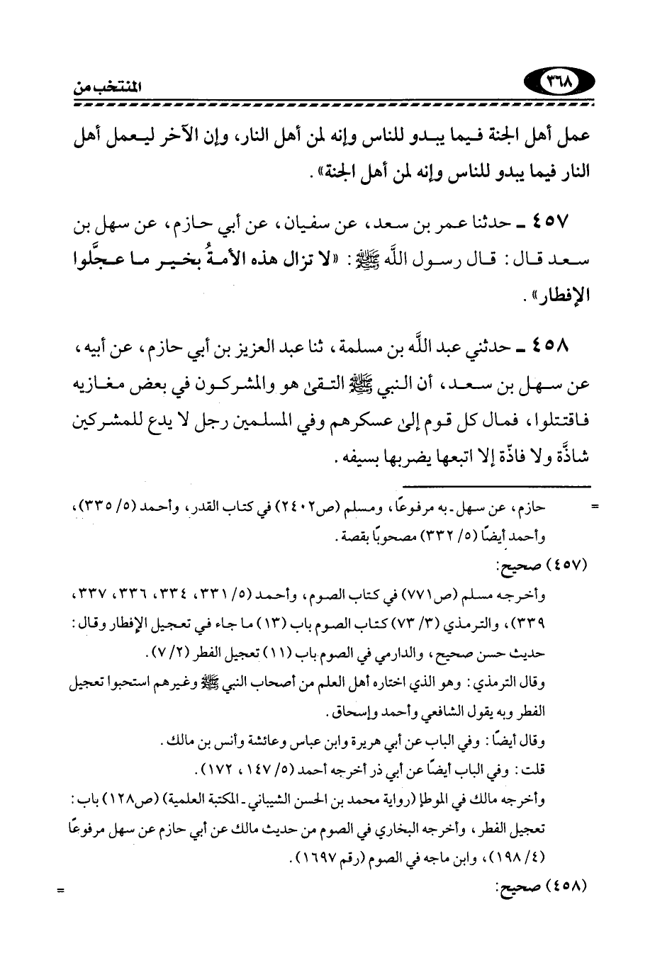 457- حَدَّثَنَا عُمَرُ بْنُ سَعْدٍ، عَنْ سُفْيَانَ، عَنْ أَبِي حَازِمٍ، عَنْ سَهْلِ بْنِ سَعْدٍ قَالَ: قَالَ رَسُولَ اللَّهِ, صَلَّى اللهُ عَلَيْهِ وَسَلَّمَ: "لَا تَزَالُ هَذِهِ الْأُمَّةُ بِخَيْرٍ مَا عَجَّلُوا الْإِفْطَارَ".
