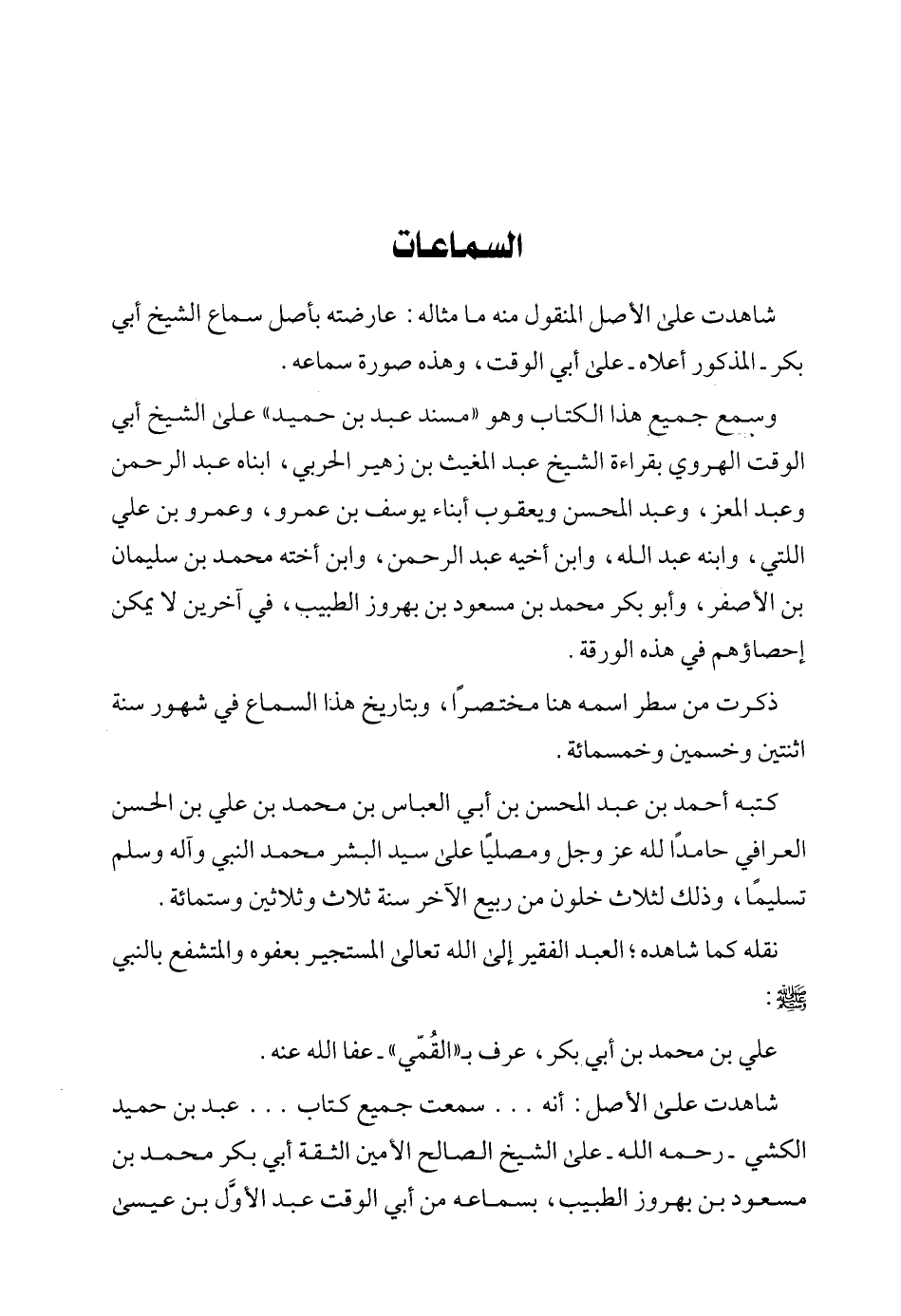 شاهدت على الأصل: أنه ... سمعت جميع كتاب ... عبد بن حميد الكشي -رحمه الله- على الشيخ الصالح الأمين الثقة أبي بكر محمد بن مسعود بن بهروز الطبيب، بسماعه من أبي الوََقْتِ عَبْدُ الأَوَّلِ بنُ عِيسَى