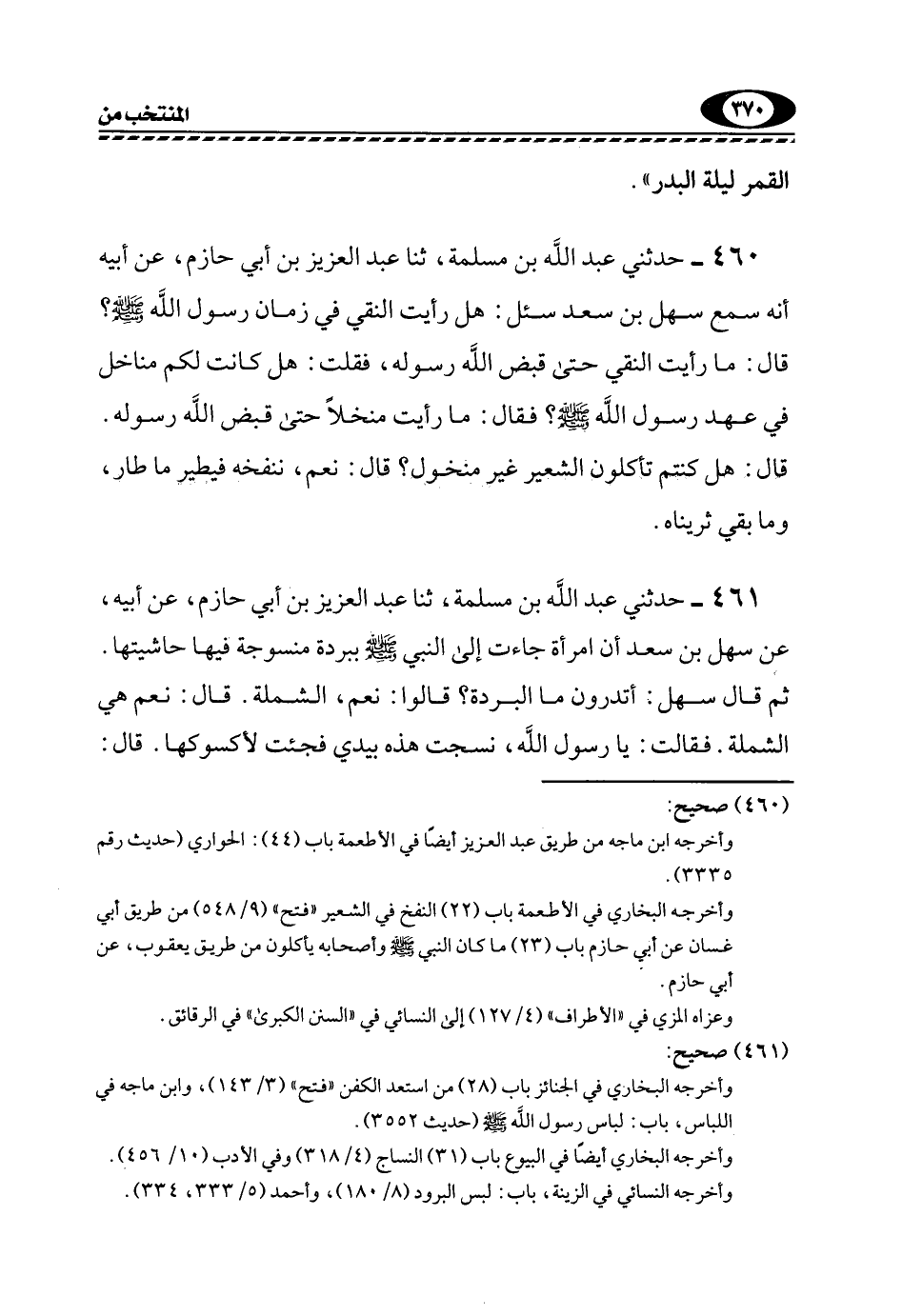 461- حَدَّثَنِي عَبْدُ اللَّهِ بْنُ مَسْلَمَةَ، ثَنَا عَبْدُ الْعَزِيزِ بْنُ أَبِي حَازِمٍ، عَنْ أَبِيهِ، عَنْ سَهْلِ بْنِ سَعْدٍ, أَنَّ امْرَأَةً جَاءَتْ إِلَى النَّبِيِّ -صَلَّى اللهُ عَلَيْهِ وَسَلَّمَ- بِبُرْدَةٍ مَنْسُوجَةٍ فِيهَا حَاشِيَتُهَا. ثُمَّ قَالَ سَهْلٌ: أَتَدْرُونَ مَا الْبُرْدَةُ؟ قَالُوا: نَعَمْ، الشَّمْلَةُ. قَالَ: نَعَمْ هِيَ الشَّمْلَةُ. فَقَالَتْ: يَا رَسُولَ اللَّهِ، نَسَجْتُ هَذِهِ بِيَدِي, فجئت لأكسوكها. قال: