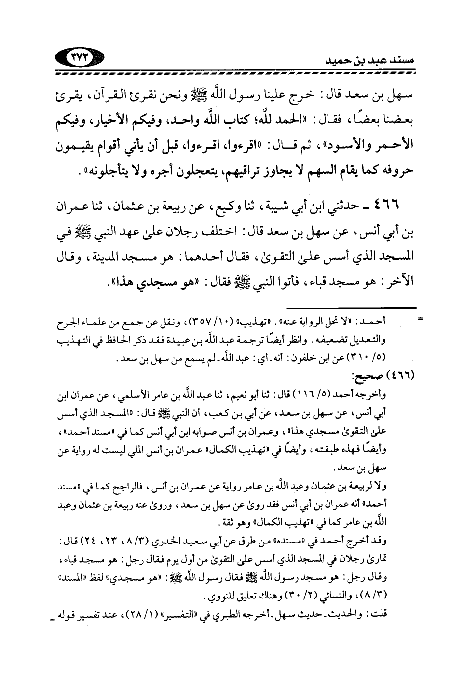 466- حَدَّثَنِي ابْنُ أَبِي شَيْبَةَ، ثَنَا وَكِيعُ، عَنْ رَبِيعَةَ بْنِ عُثْمَانَ، ثَنَا عِمْرَانَ بْنِ أَبِي أَنَسٍ، عَنْ سَهْلِ بْنِ سَعْدٍ قَالَ: اخْتَلَفَ رَجُلَانِ عَلَى عَهْدِ النَّبِيِّ -صَلَّى اللهُ عَلَيْهِ وَسَلَّمَ- فِي الْمَسْجِدِ الَّذِي أُسِّسَ عَلَى التَّقْوَى، فَقَالَ أَحَدُهُمَا: هُوَ مَسْجِدُ الْمَدِينَةِ، وَقَالَ الْآخَرُ: هُوَ مَسْجِدُ قُبَاءَ، فَأَتَوُا النَّبِيَّ -صَلَّى اللهُ عَلَيْهِ وَسَلَّمَ- فقال: "هو مسجدي هذا".