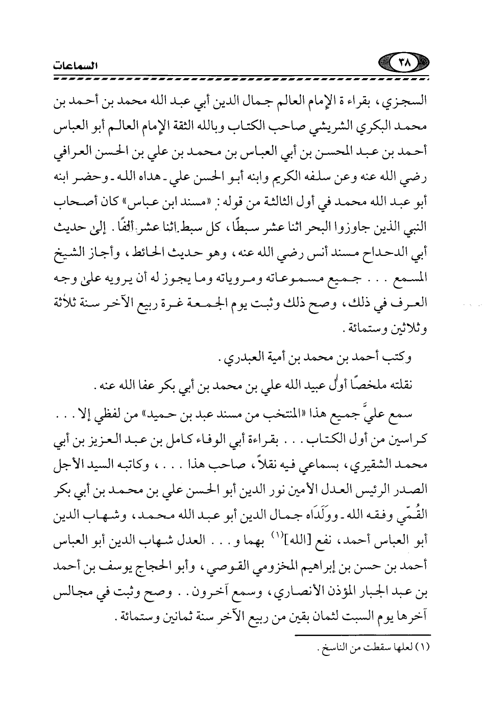 السجزي، بقراءة الإمام العالم جمال الدين أبي عبد الله محمد بن أحمد بن محمد البكري الشريشي صاحب الكتاب وبالله الثقة الإمام العالم أبو العباس أحمد بن عبد المحسن بن أبي العباس بن محمد بن علي بن الحسن العرافي -رضي الله عنه وعن سلفه الكريم- وابنه أبو الحسن علي -هداه الله- وحضر ابنه أبو عبد الله محمد في أول الثالثة من قوله: "مسند ابن عباس" كان أصحاب النبي الَّذِينَ جَاوَزُوا الْبَحْرَ اثْنَيْ عَشَرَ سبطا، كل سبط اثنا عشر ألفا, إلى حديث أبي الدحداح مسند أنس رضي الله عنه، وهو حديث الحائط، وأجاز الشيخ المسمع ... جميع مسموعاته ومروياته وما يجوز له أن يرويه على وجه العرف في ذلك، وصح ذلك وثبت يوم الجمعة غرة ربيع الآخر سنة ثلاث وثلاثين وستمائة.