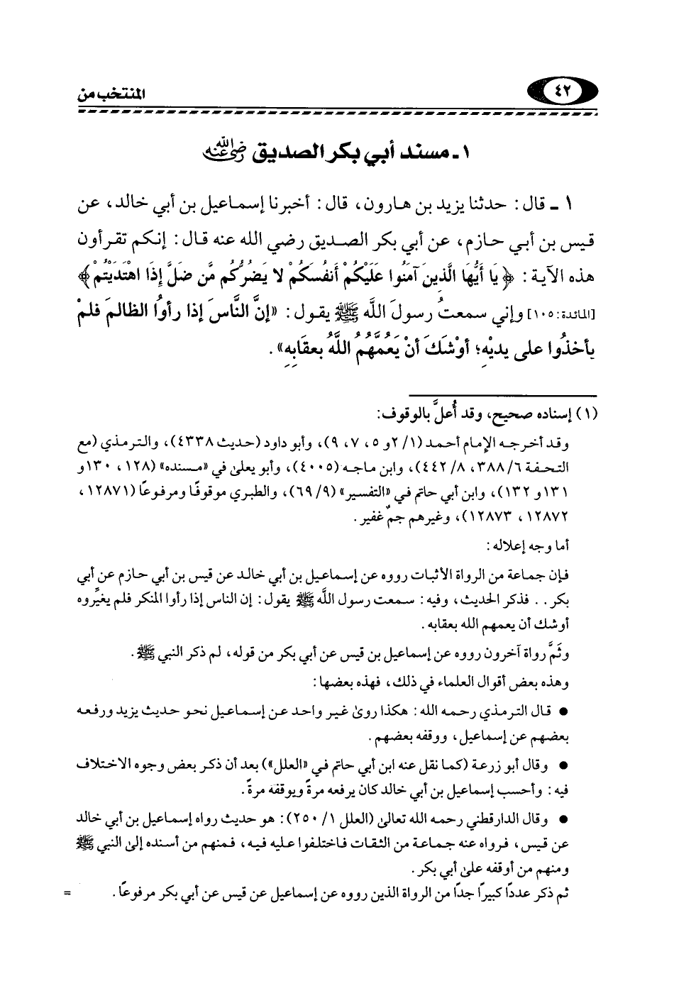 1- قَالَ: حَدَّثَنَا يَزِيدُ بْنُ هَارُونَ، قَالَ: أَخْبَرَنَا إِسْمَاعِيلُ بْنُ أَبِي خَالِدٍ، عَنْ قَيْسِ بْنِ أَبِي حَازِمٍ، عَنْ أَبِي بَكْرٍ الصِّدِّيقِ -رَضِيَ اللَّهُ عَنْهُ- قَالَ: إِنَّكُمْ تقرءون هذه الآية: {أَيُّهَا الَّذِينَ آمَنُوا عَلَيْكُمْ أَنْفُسَكُمْ لَا يَضُرُّكُمْ مَنْ ضَلَّ إِذَا اهْتَدَيْتُمْ} [المائدة: 105] وَإِنِّي سَمِعْتُ رَسُولَ اللَّهِ -صَلَّى اللهُ عَلَيْهِ وَسَلَّمَ- يَقُولُ: "إِنَّ النَّاسَ إِذَا رَأَوُا الظَّالِمَ فَلَمْ يَأْخُذُوا عَلَى يَدَيْهِ؛ أَوْشَكَ أَنْ يَعُمَّهُمُ اللَّهُ بِعِقَابِهِ".
