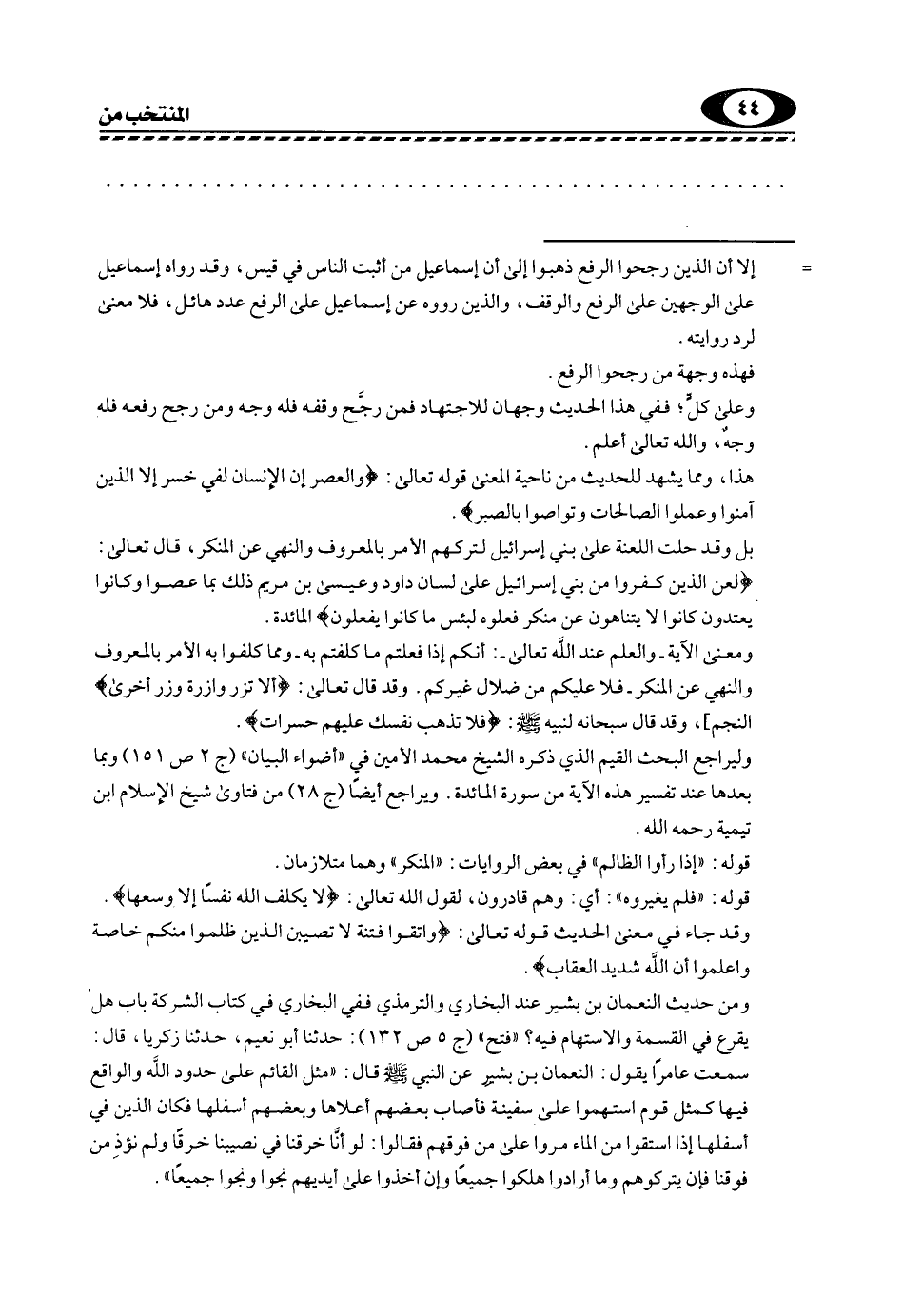 = إلا أن الذين رجحوا الرفع ذهبوا إلى أن إسماعيل من أثبت الناس في قيس، وقد رواه إسماعيل على الوجهين على الرفع والوقف، والذين رووه عن إسماعيل على الرفع عدد هائل، فلا معنى لرد روايته.