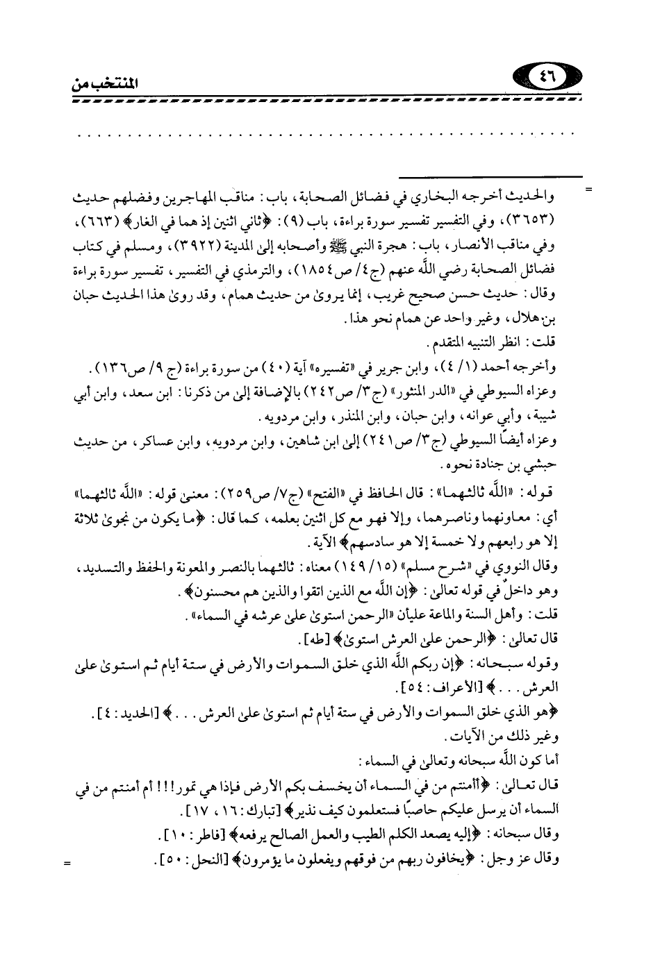 = والحديث أخرجه البخاري في فضائل الصحابة، باب: مناقب المهاجرين وفضلهم, حديث "3653", وفي التفسير تفسير سورة براءة، باب "9": {ثَانِيَ اثْنَيْنِ إِذْ هُمَا فِي الْغَارِ} "663"، وفي مناقب الأنصار، باب: هجرة النَّبِيَّ -صَلَّى اللهُ عَلَيْهِ وَسَلَّمَ- وأصحابه إلى المدينة "3922"، ومسلم في كتاب فضائل الصحابة -رضي الله عنهم- "ج4 ص1854"، والترمذي في التفسير، تفسير سورة براءة وقال: حديث حسن صحيح غريب، إنما يروى من حديث همام، وقد روى هذا الحديث حبان بن هلال، وغير واحد عن همام نحو هذا.