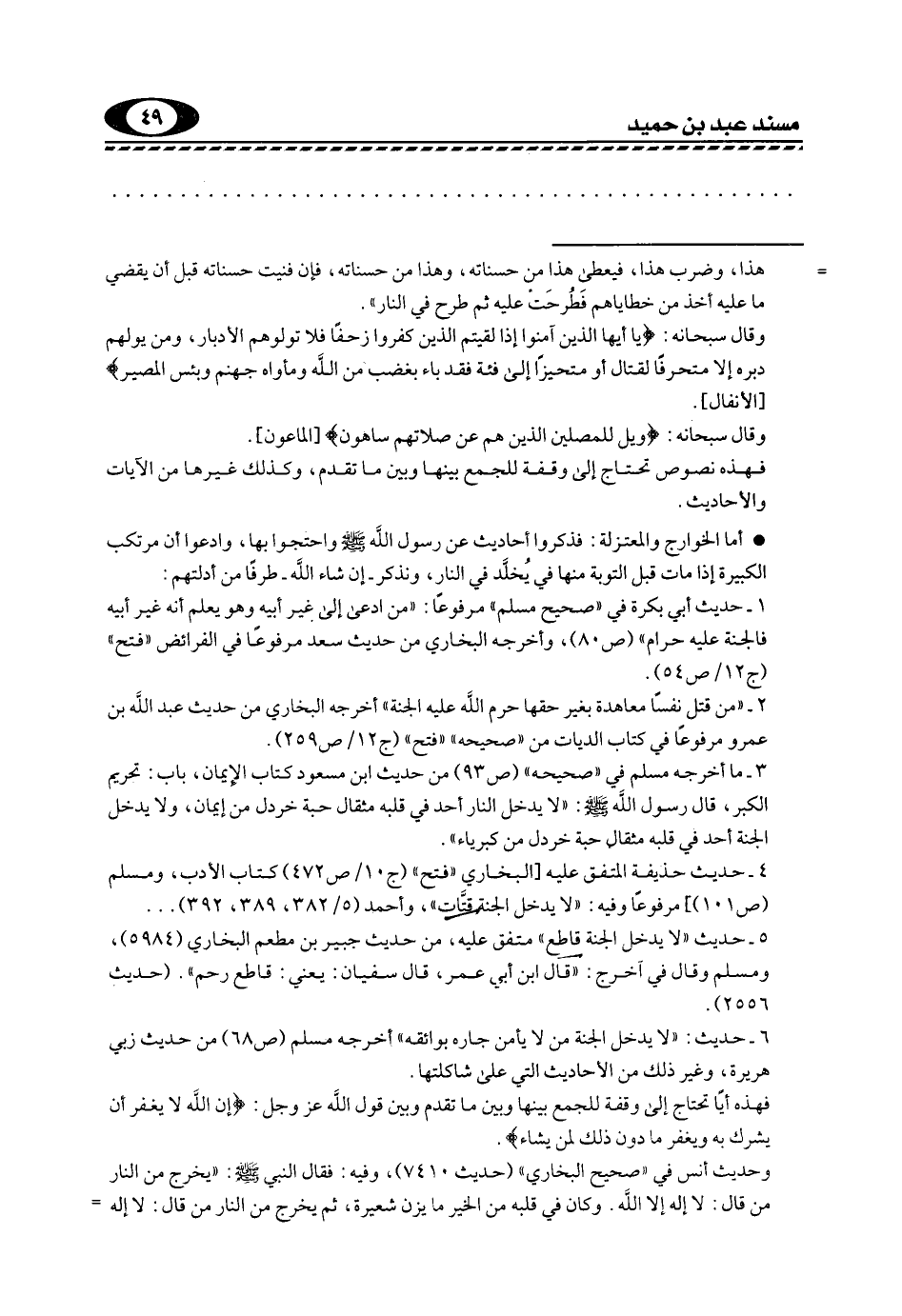 5- حديث: "لا يدخل الجنة قاطع" متفق عليه، من حديث جبير بن مطعم البخاري "5984"، ومسلم وقال في آخره: "قال ابن أبي عمر: قال سفيان: يعني: قاطع رحم". "حديث 2556".