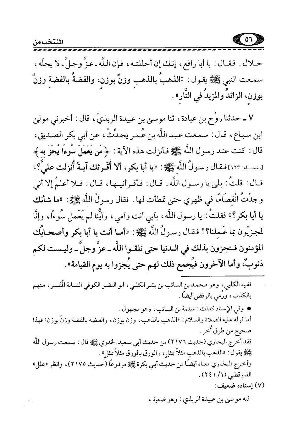 7- حَدَّثَنَا رَوْحُ بْنُ عُبَادَةَ، ثَنَا مُوسَى بْنُ عُبَيْدَةَ الرَّبَذِيُّ، قَالَ: أَخْبَرَنِي مَوْلَى ابْنِ سِبَاعٍ، قَالَ: سَمِعْتُ عَبْدَ اللَّهِ بْنَ عُمَرَ يُحَدِّثُ، عَنْ أَبِي بَكْرٍ الصِّدِّيقِ، قَالَ: كُنْتُ عِنْدَ رَسُولِ اللَّهِ -صَلَّى اللهُ عَلَيْهِ وَسَلَّمَ- فَأُنْزِلَتْ هَذِهِ الْآيَةُ: {مَنْ يَعْمَلْ سُوءًا يُجْزَ بِهِ} [النساء: 123] فَقَالَ رَسُولُ اللَّهِ, صَلَّى اللهُ عَلَيْهِ وَسَلَّمَ: "يَا أَبَا بَكْرٍ، أَلَا أُقْرِئُكَ آيَةً أُنْزِلَتْ عَلَيَّ؟ " قَالَ: قُلْتُ: بَلَى يَا رَسُولَ اللَّهِ, قَالَ: فَأَقْرَأَنِيهَا، قَالَ: فَلَا أَعْلَمُ إِلَّا أَنِّي وَجَدْتُ انْفِصَامًا فِي ظَهْرِي حَتَّى تَمَطَّأْتُ لَهَا. فَقَالَ رَسُولُ اللَّهِ, صَلَّى اللهُ عَلَيْهِ وَسَلَّمَ: "مَا شَأْنُكَ يَا أَبَا بَكْرٍ؟ " فَقُلْتُ: يَا رَسُولَ اللَّهِ، بِأَبِي أَنْتَ وَأُمِّي، وَأَيُّنَا لَمْ يَعْمَلْ سُوءًا، وَإِنَّا لَمَجْزِيُّونَ بِمَا عَمِلْنَا؟! فَقَالَ رَسُولُ اللَّهِ صَلَّى اللهُ عَلَيْهِ وَسَلَّمَ: "أَمَّا أَنْتَ يَا أَبَا بَكْرٍ, وَأَصْحَابُكَ الْمُؤْمِنُونَ فَتُجْزَونَ بِذَلِكَ فِي الدُّنْيَا حَتَّى تَلْقَوُا اللَّهَ -عَزَّ وَجَلَّ- وَلَيْسَتْ لَكُمْ ذُنُوبٌ، وَأَمَّا الْآخَرُونَ فَيُجْمَعُ ذَلِكَ لَهُمْ حَتَّى يُجزَوا به يوم القيامة".