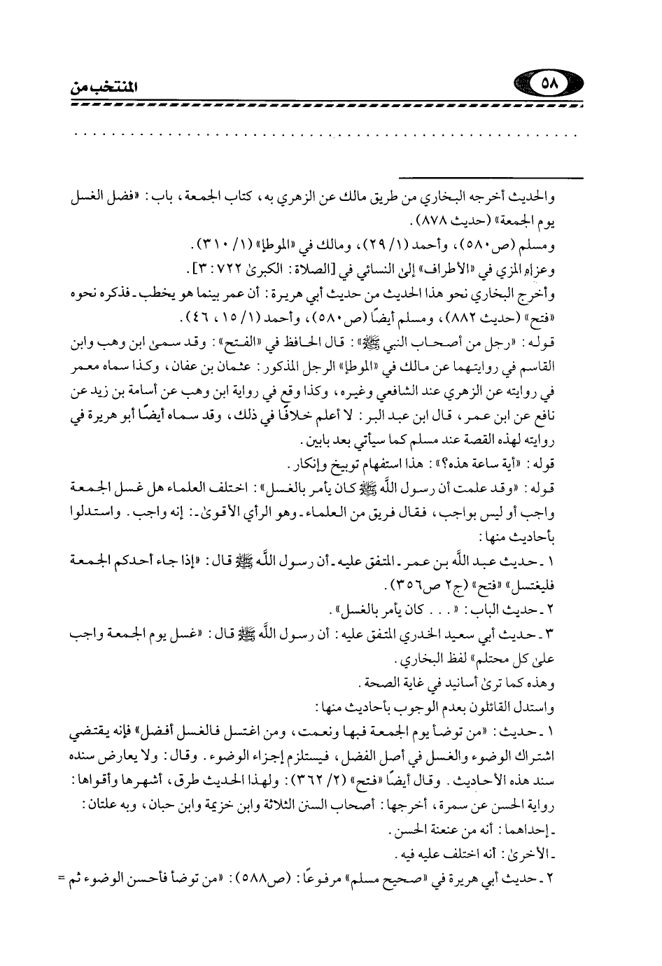 1- حديث: "مَنْ تَوَضَّأَ يَوْمَ الْجُمُعَةِ فَبِهَا ونعمت، ومن اغتسل فالغسل أفضل" فإنه يقتضي اشتراك الوضوء والغسل في أصل الفضل، فيستلزم إجزاء الوضوء. وقال: ولا يعارض سنده سند هذه الأحاديث. وقال أيضا "فتح" "2/ 362": ولهذا الحديث طرق، أشهرها وأقواها رواية الحسن عن سمرة، أخرجها أصحاب السنن الثلاثة وابن خزيمة وابن حبان، وبه علتان: