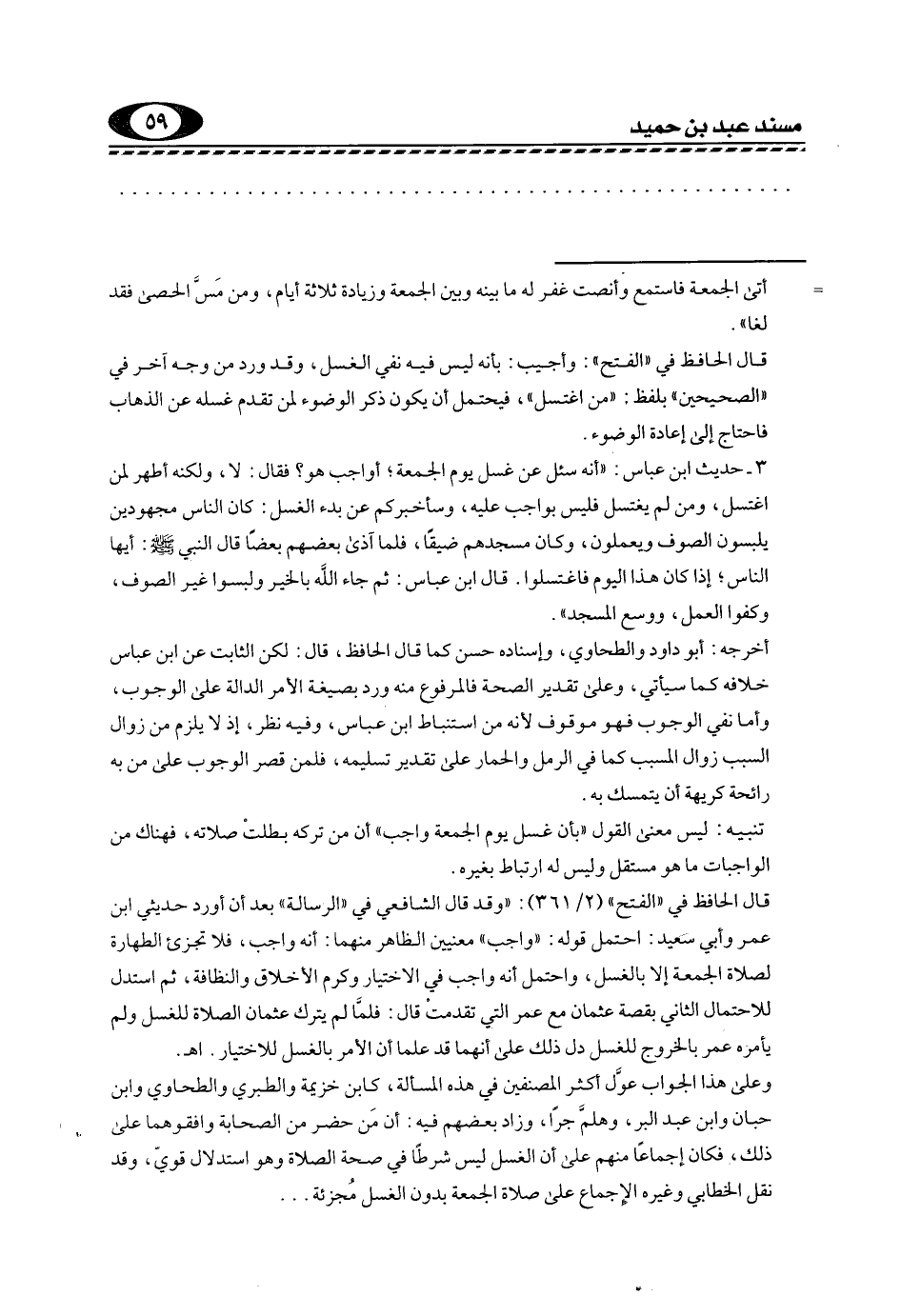 3- حديث ابْنِ عَبَّاسٍ: "أَنَّهُ سُئل عَنِ غسل يوم الجمعة؛ أواجب هو؟ فقال: لا، ولكنه أطهر لمن اغتسل، ومن لم يغتسل فليس بواجب عليه، وسأخبركم عن بدء الغسل: كان الناس مجهودين يلبسون الصوف ويعملون، وكان مسجدهم ضيقا، فلما آذى بعضهم بعضا قَالَ النَّبِيُّ صَلَّى اللهُ عَلَيْهِ وسلم: "أَيُّهَا النَّاسُ؛ إِذَا كَانَ هَذَا اليوم فاغتسلوا" قال ابن عباس: ثم جاء الله بالخير ولبسوا غير الصوف، وكفوا العمل، ووسع المسجد".