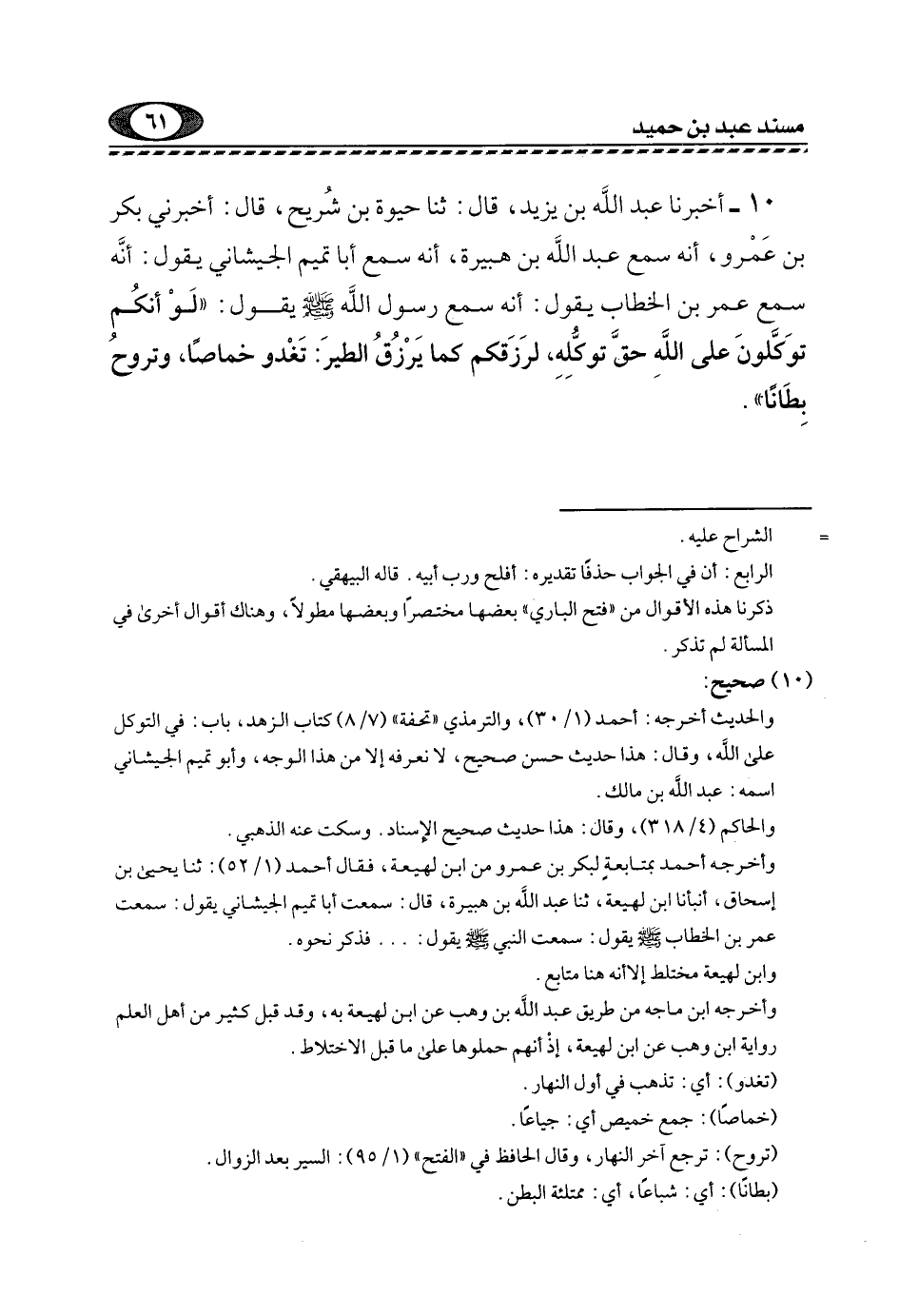 10- أَخْبَرَنَا عَبْدُ اللَّهِ بْنُ يَزِيدَ، قَالَ: ثَنَا حَيْوَةُ بنُ شُرَيْحٍ، قَالَ: أَخْبَرَنِي بَكْرُ بْنُ عَمْرٍو، أَنَّهُ سَمِعَ عَبْدَ اللَّهِ بْنَ هُبَيْرَةَ، أَنَّهُ سَمِعَ أَبَا تَمِيمٍ الْجَيَشَانِيَّ يَقُولُ: إِنَّهُ سَمِعَ عُمَرَ بْنَ الْخَطَّابِ يَقُولُ: إِنَّهُ سَمِعَ رَسُولَ اللَّهِ -صَلَّى اللهُ عَلَيْهِ وَسَلَّمَ- يَقُولُ: "لَوْ أَنَّكُمْ تَوَكَّلون عَلَى اللَّهِ حَقَّ تَوَكُّلِهِ، لَرَزَقَكُمْ كَمَا يَرْزُقُ الطَّيْرَ, تَغْدُو خِمَاصًا وتروح بطانا".