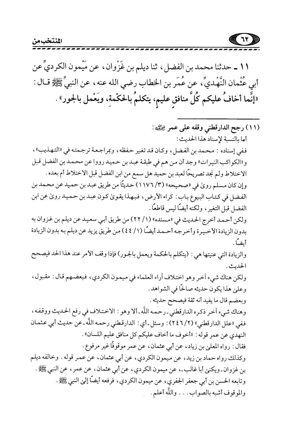 11- حَدَّثَنَا مُحَمَّدُ بْنُ الْفَضْلِ، ثَنَا دَيْلَمُ بْنُ غَزْوَانَ، عَنْ مَيْمُونٍ الْكُرْدِيِّ, عَنْ أَبِي عُثْمَانَ النَّهْدِيِّ، عَنْ عُمَرَ بْنِ الْخَطَّابِ -رَضِيَ اللَّهُ عَنْهُ- عَنِ النَّبِيِّ -صَلَّى اللهُ عَلَيْهِ وَسَلَّمَ- قَالَ: "إِنَّمَا أَخَافُ عَلَيْكُمْ كُلَّ مُنَافِقٍ عَلِيمٍ، يتكلم بالحكمة، ويعمل بالجور".