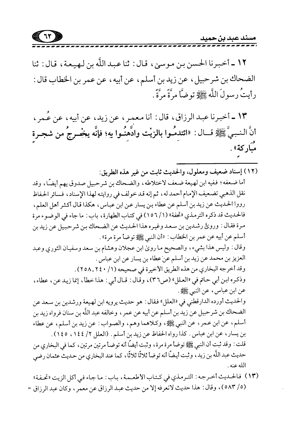 13- أَخْبَرَنَا عَبْدُ الرَّزَّاقِ، قَالَ: أنا مَعْمَرٌ، عَنْ زَيْدٍ، عَنْ أَبِيهِ، عَنْ عُمَرَ، أَنَّ النَّبِيَّ -صَلَّى اللهُ عَلَيْهِ وَسَلَّمَ- قَالَ: "ائْتَدِمُوا بِالزَّيْتِ وَادَّهِنُوا بِهِ؛ فَإِنَّهُ يخرج من شجرة مباركة".