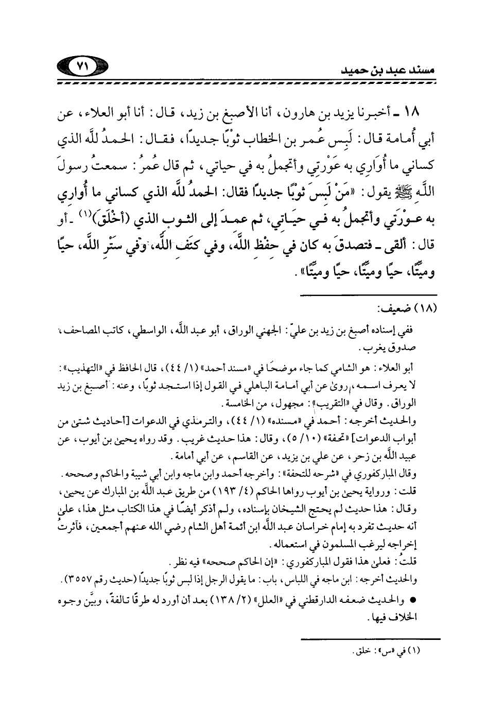 18- أَخْبَرَنَا يَزِيدُ بْنُ هَارُونَ، أنا الْأَصْبَغُ بْنُ زَيْدٍ، قَالَ: أنا أَبُو الْعَلَاءِ، عَنْ أَبِي أُمَامَةَ قَالَ: لَبِسَ عُمَرُ بْنُ الْخَطَّابِ ثَوْبًا جَدِيدًا، فَقَالَ: الْحَمْدُ لِلَّهِ الَّذِي كَسَانِي مَا أُواري بِهِ عَوْرَتِي وَأَتَجَمَّلُ بِهِ فِي حَيَاتِي، ثُمَّ قَالَ عُمَرُ: سَمِعْتُ رَسُولَ اللَّهِ -صَلَّى اللهُ عَلَيْهِ وَسَلَّمَ- يَقُولُ: "مَنْ لَبِسَ ثَوْبًا جَدِيدًا فَقَالَ: الْحَمْدُ لِلَّهِ الَّذِي كَسَانِي مَا أُوَارِي بِهِ عَوْرَتِي, وَأَتَجَمَّلُ بِهِ فِي حَيَاتِي، ثُمَّ عَمَدَ إِلَى الثَّوْبِ الَّذِي "أَخْلَقَ"1 -أَوْ قَالَ: أَلْقَى- فَتَصَدَّقَ بِهِ كَانَ فِي حِفْظِ اللَّهِ، وَفِي كَنَفِ الله، وفي سِتْرِ اللَّهِ، حَيًّا وَمَيِّتًا، حَيًّا وميتا، وحيا وميتا".