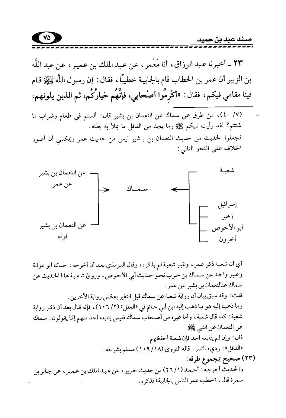 23- أَخْبَرَنَا عَبْدُ الرَّزَّاقِ، أنا مَعْمَرٌ، عَنْ عَبْدِ الْمَلِكِ بْنِ عُمَيْرٍ، عَنْ عَبْدِ اللَّهِ بْنِ الزُّبَيْرِ أَنَّ عُمَرَ بْنَ الْخَطَّابِ قَامَ بِالْجَابِيَةِ خَطِيبًا، فَقَالَ: إِنَّ رَسُولَ اللَّهِ -صَلَّى اللهُ عَلَيْهِ وَسَلَّمَ- قَامَ فِينَا مَقَامِي فِيكُمْ، فَقَالَ: "أَكْرِمُوا أَصْحَابِي؛ فَإِنَّهُمْ خِيَارُكُمْ، ثُمَّ الذين يلونهم،