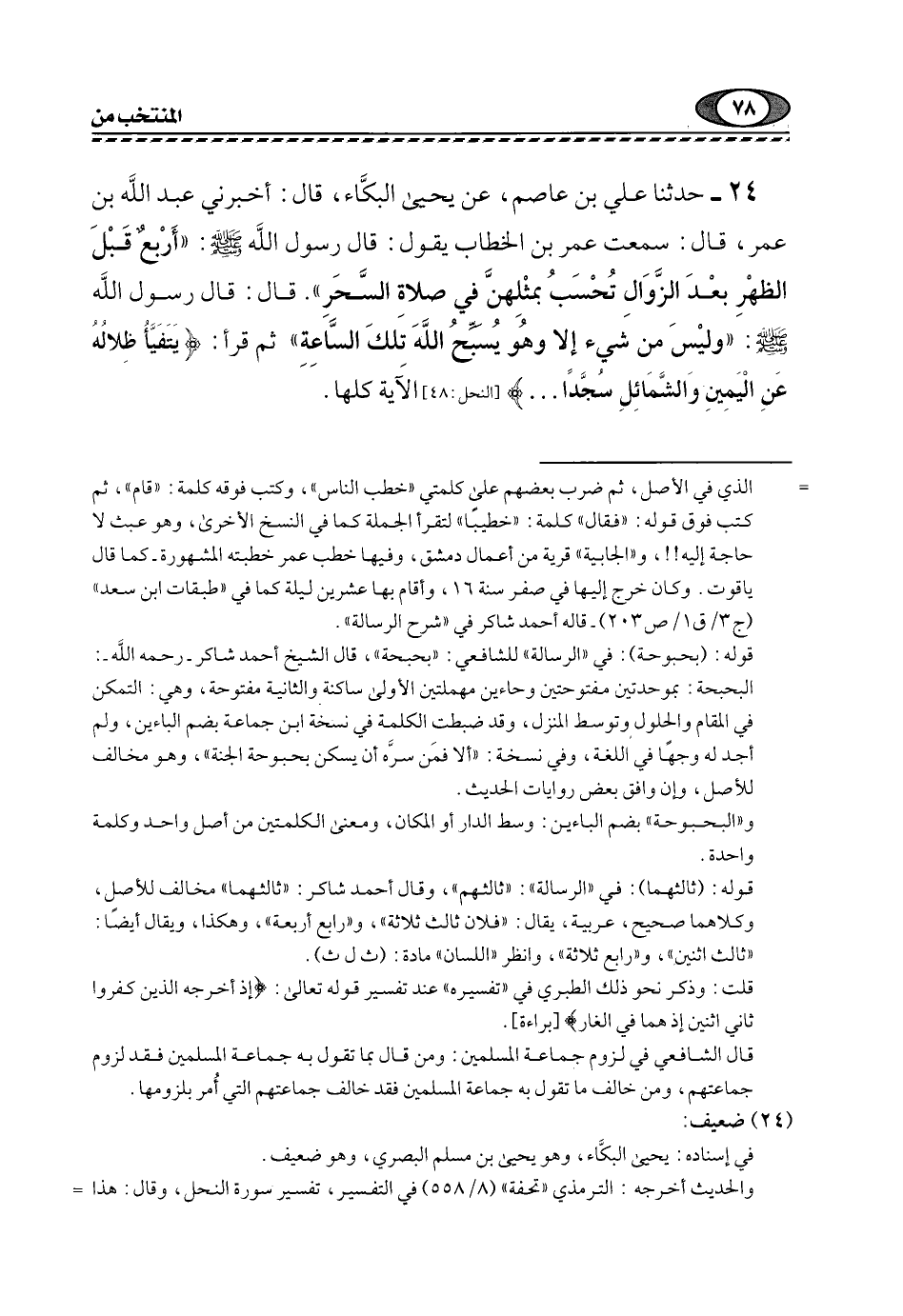 24- حَدَّثَنَا عَلِيُّ بْنُ عَاصِمٍ، عَنْ يَحْيَى الْبَكَّاءِ، قَالَ: أَخْبَرَنِي عَبْدُ اللَّهِ بْنُ عُمَرَ، قَالَ: سَمِعْتُ عُمَرَ بْنَ الْخَطَّابِ يَقُولُ: قَالَ رَسُولَ اللَّهِ, صَلَّى اللهُ عَلَيْهِ وَسَلَّمَ: "أَرْبَعٌ قَبْلَ الظُّهْرِ بَعْدَ الزوال تحسب بِمِثْلِهِنَّ فِي صَلَاةِ السَّحَر". قَالَ: قَالَ رَسُولُ اللَّهِ, صَلَّى اللهُ عَلَيْهِ وَسَلَّمَ: "وَلَيْسَ مِنْ شَيْءٍ, إِلَّا وَهُوَ يسبِّح اللَّهَ تِلْكَ السَّاعَةَ" ثُمَّ قَرَأَ: {يَتَفَيَّأُ ظِلالُهُ عَنِ الْيَمِينِ وَالشَّمَائِلِ سُجَّدًا ... } [النحل: 48] الآية كلها.